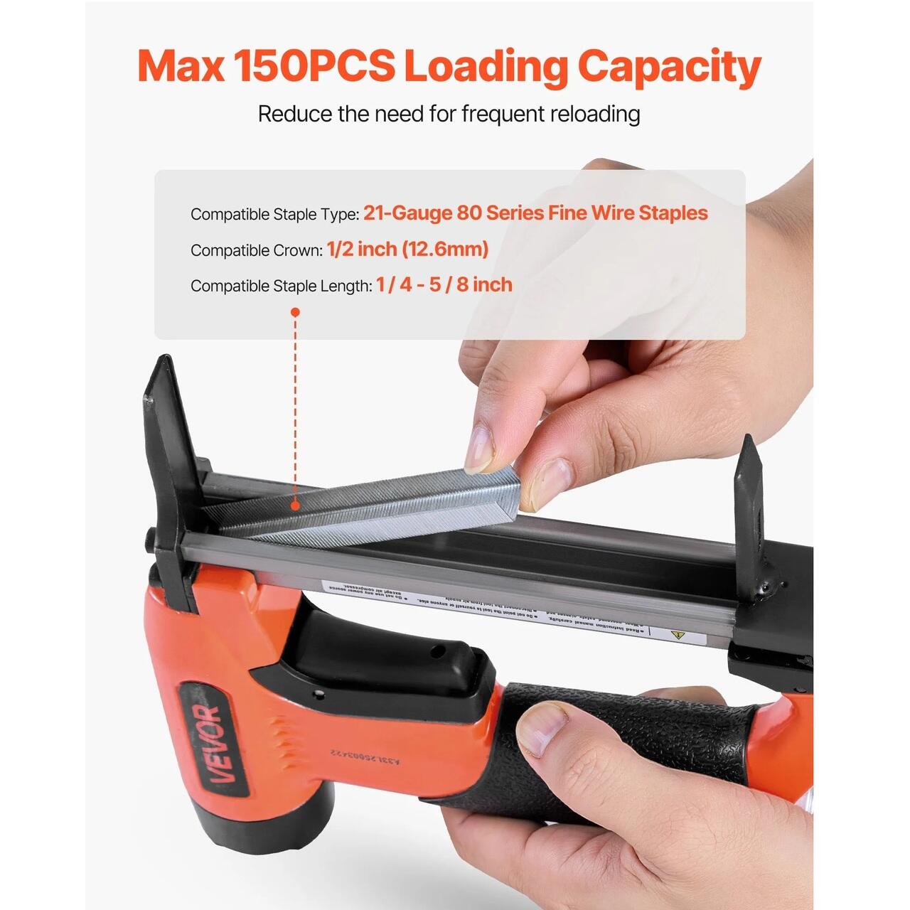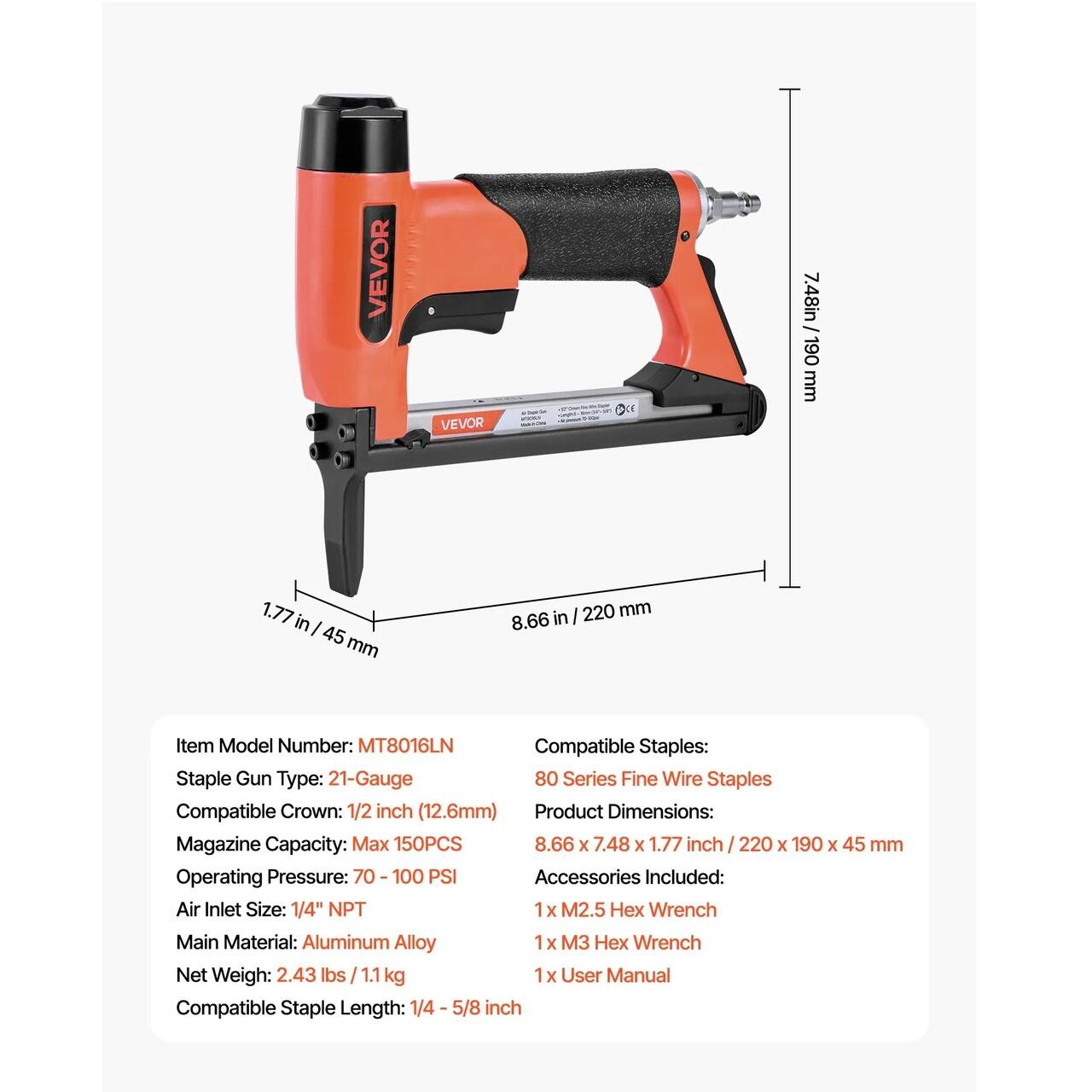 Capsator pneumatic VEVOR, calibru 21, presiune 4.8-7 Bar, lungime capse 6-16 mm, capacitate 150 buc, 220x190x45 mm