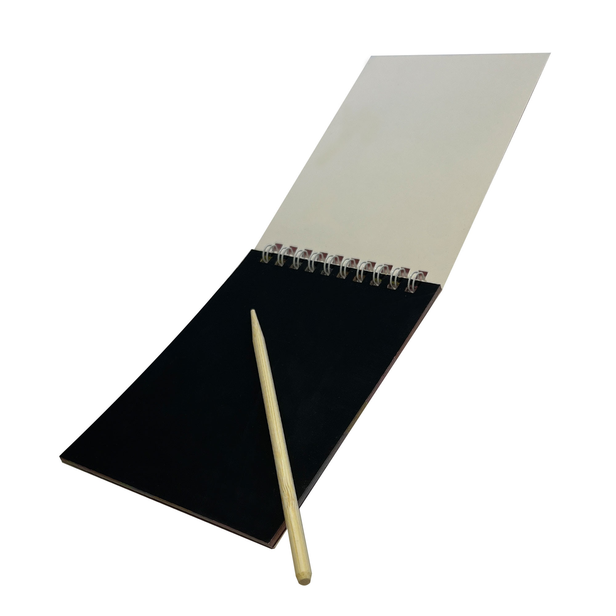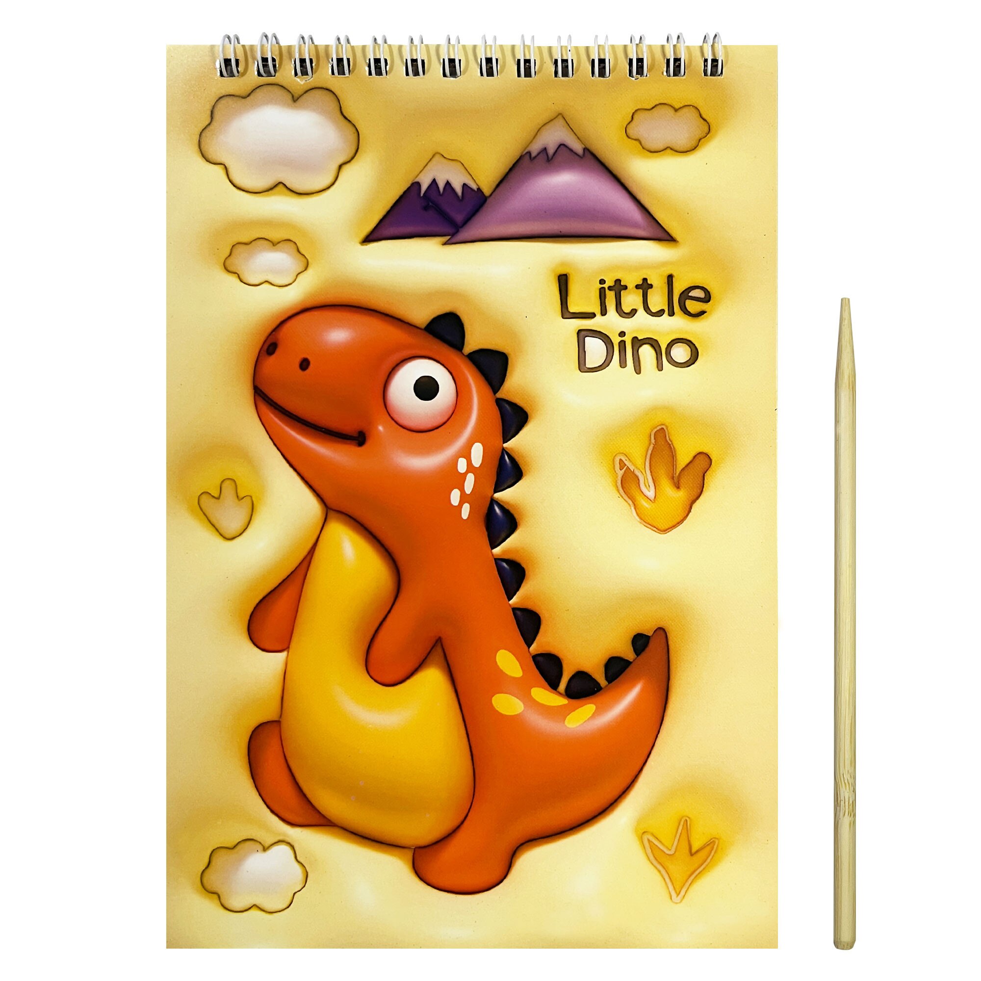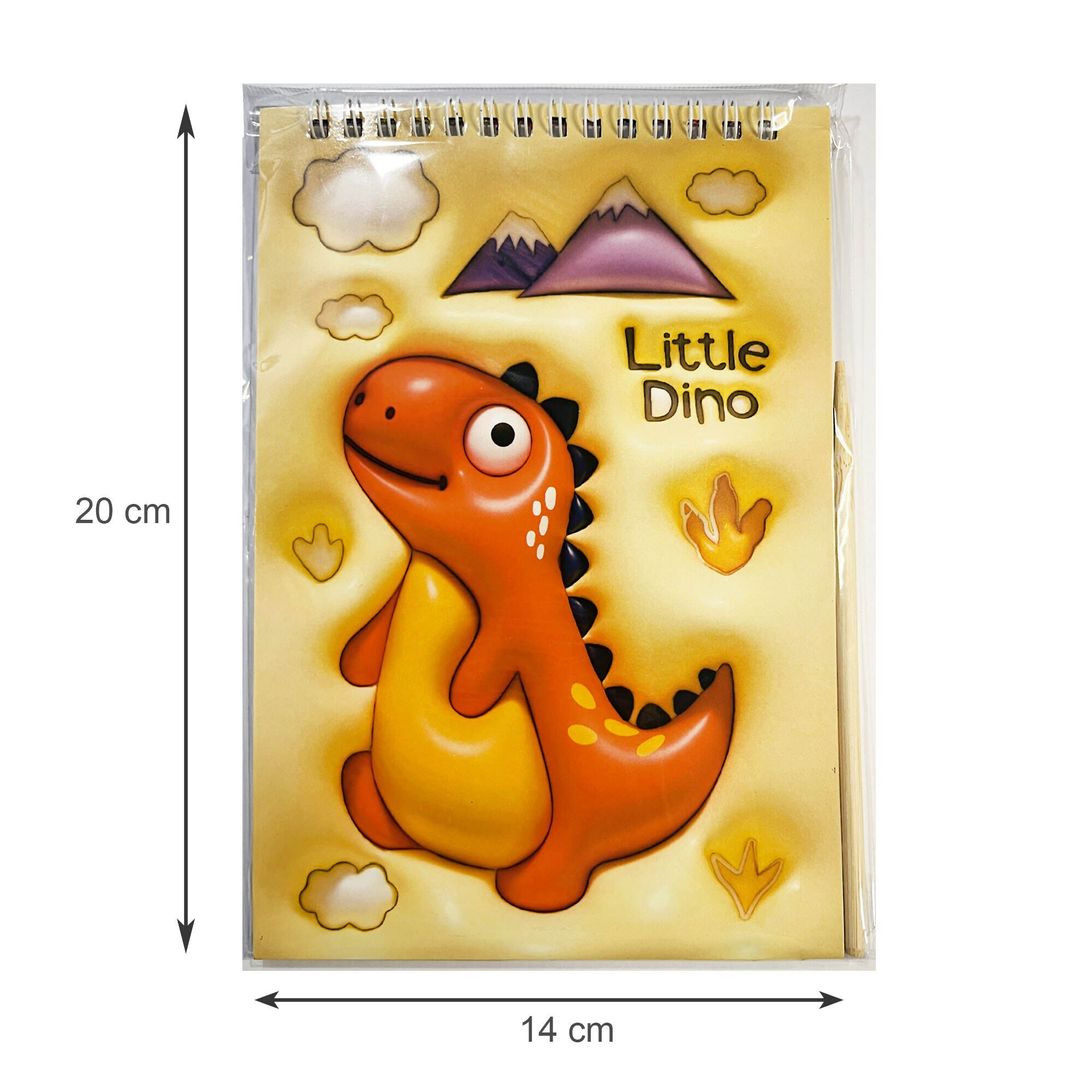 Carnetel desen prin zgâriere Little Dino, 14x20 cm, spiralat, include creion din lemn, foi negre, multicolor