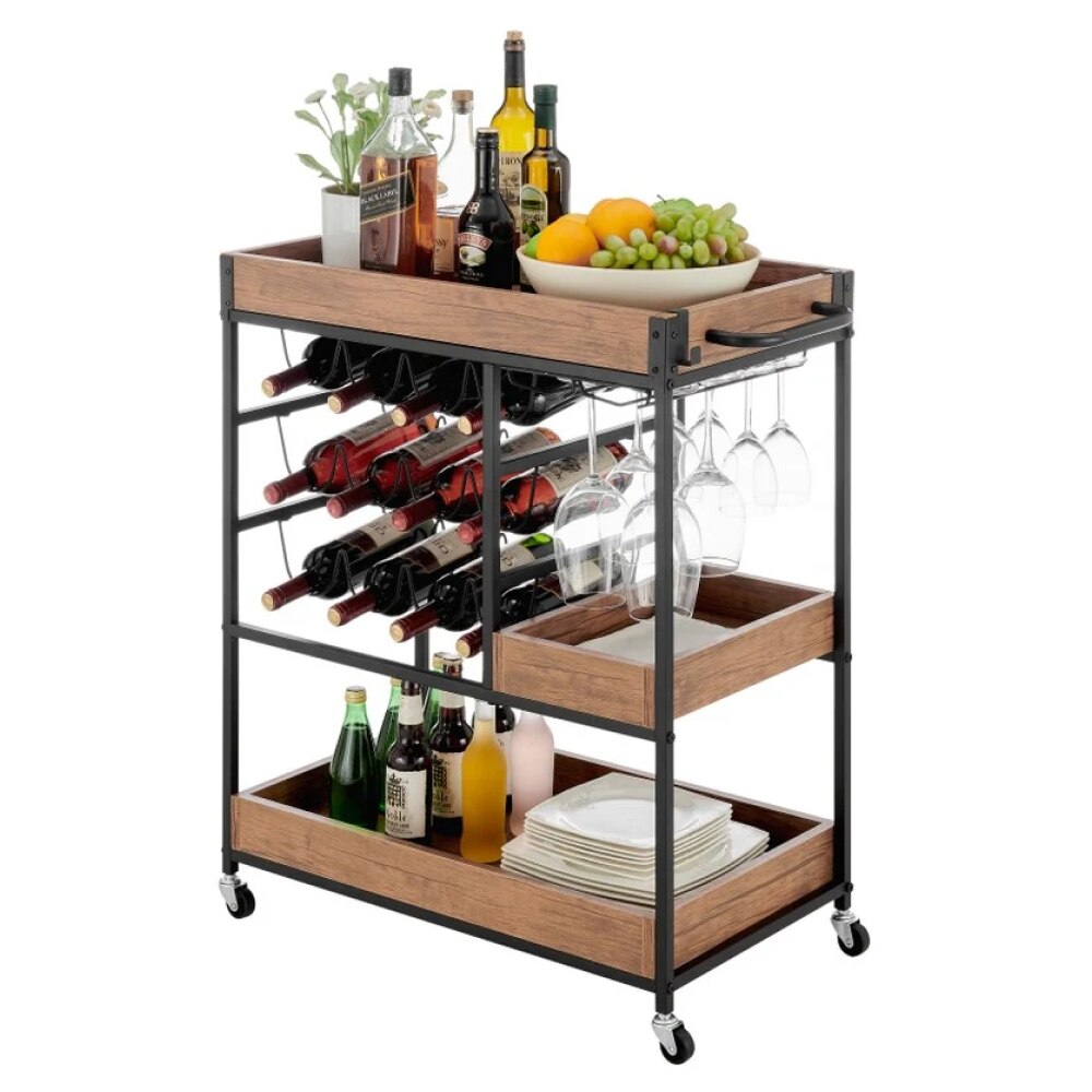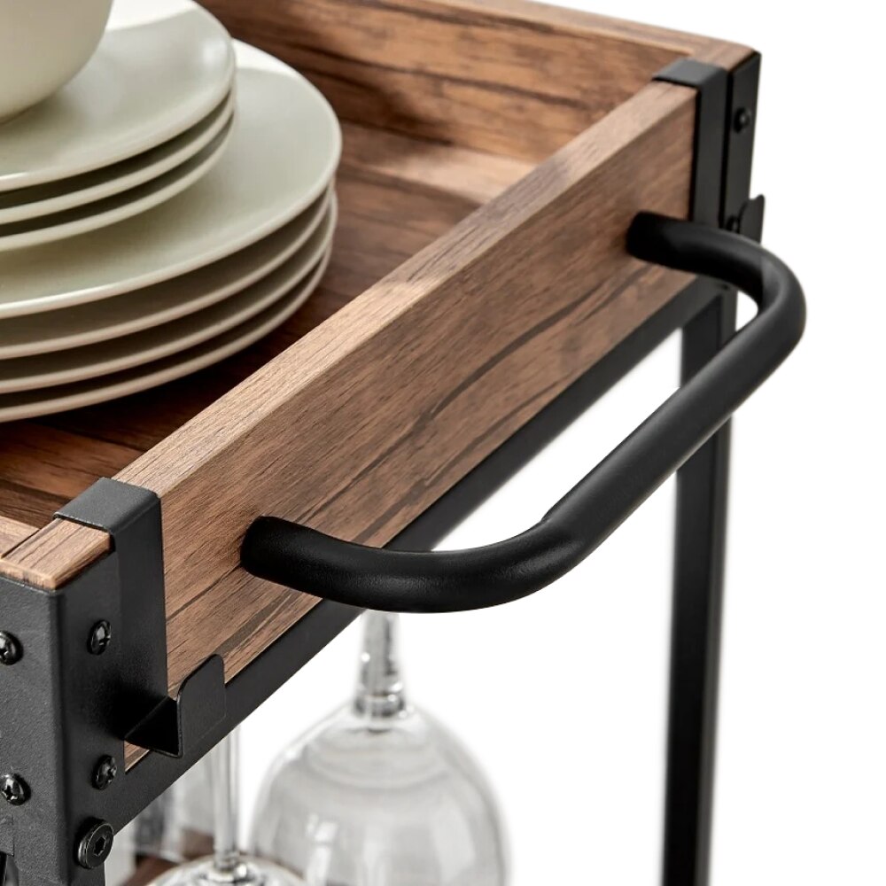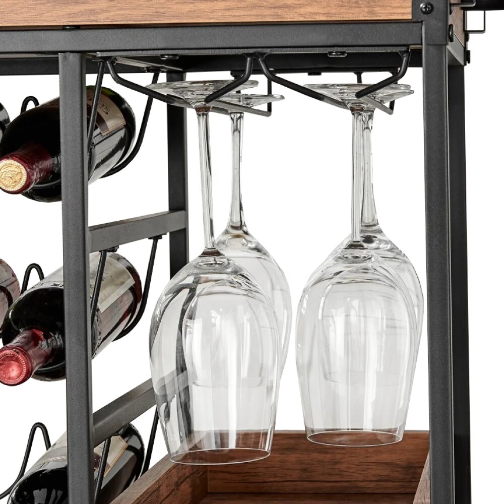 Carucior servire, suport sticla vin metal negru mdf stejar Portis 83x43x90 cm