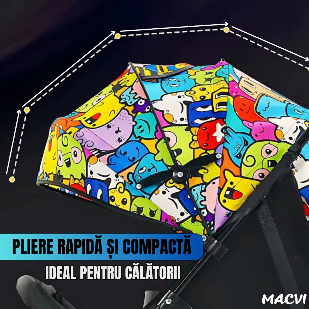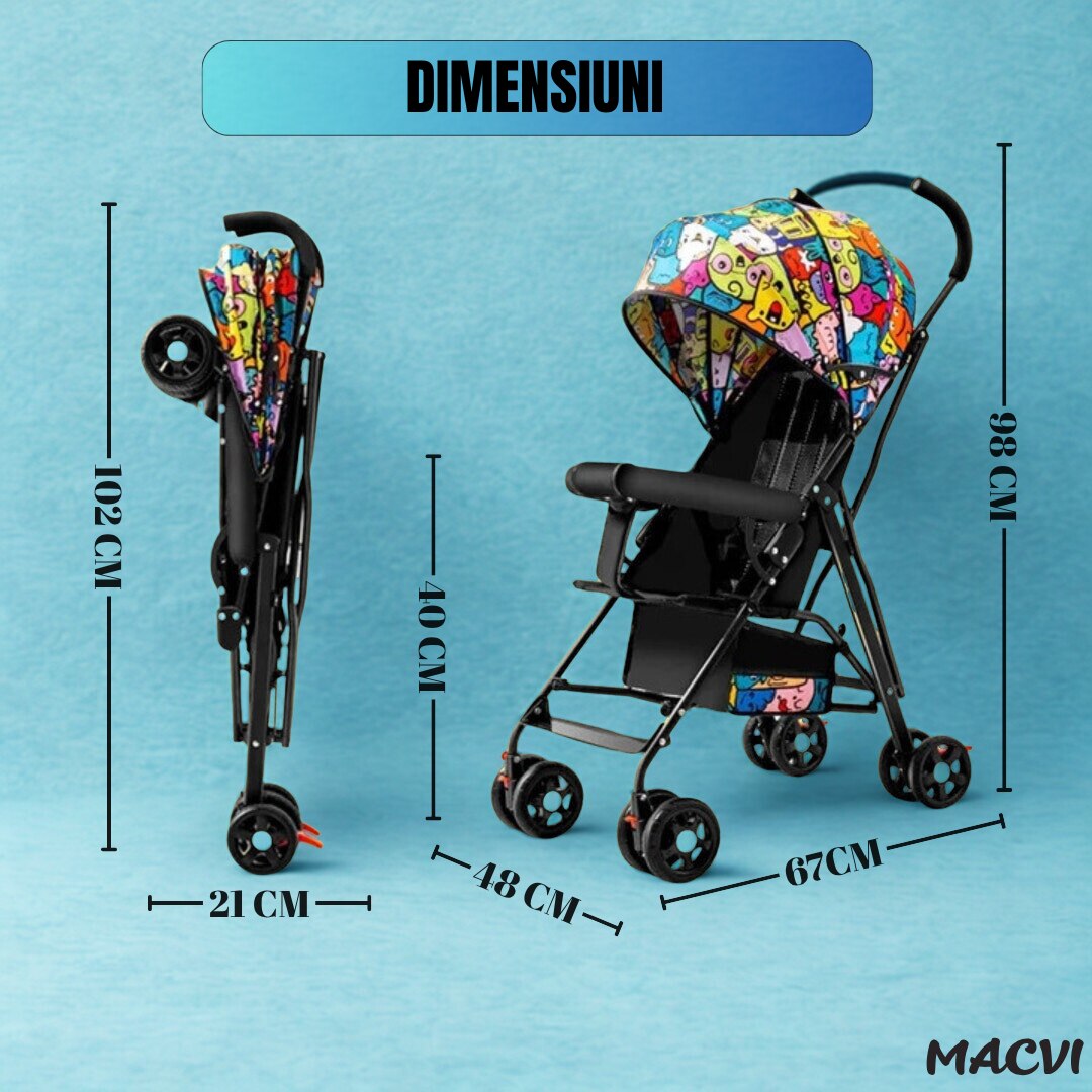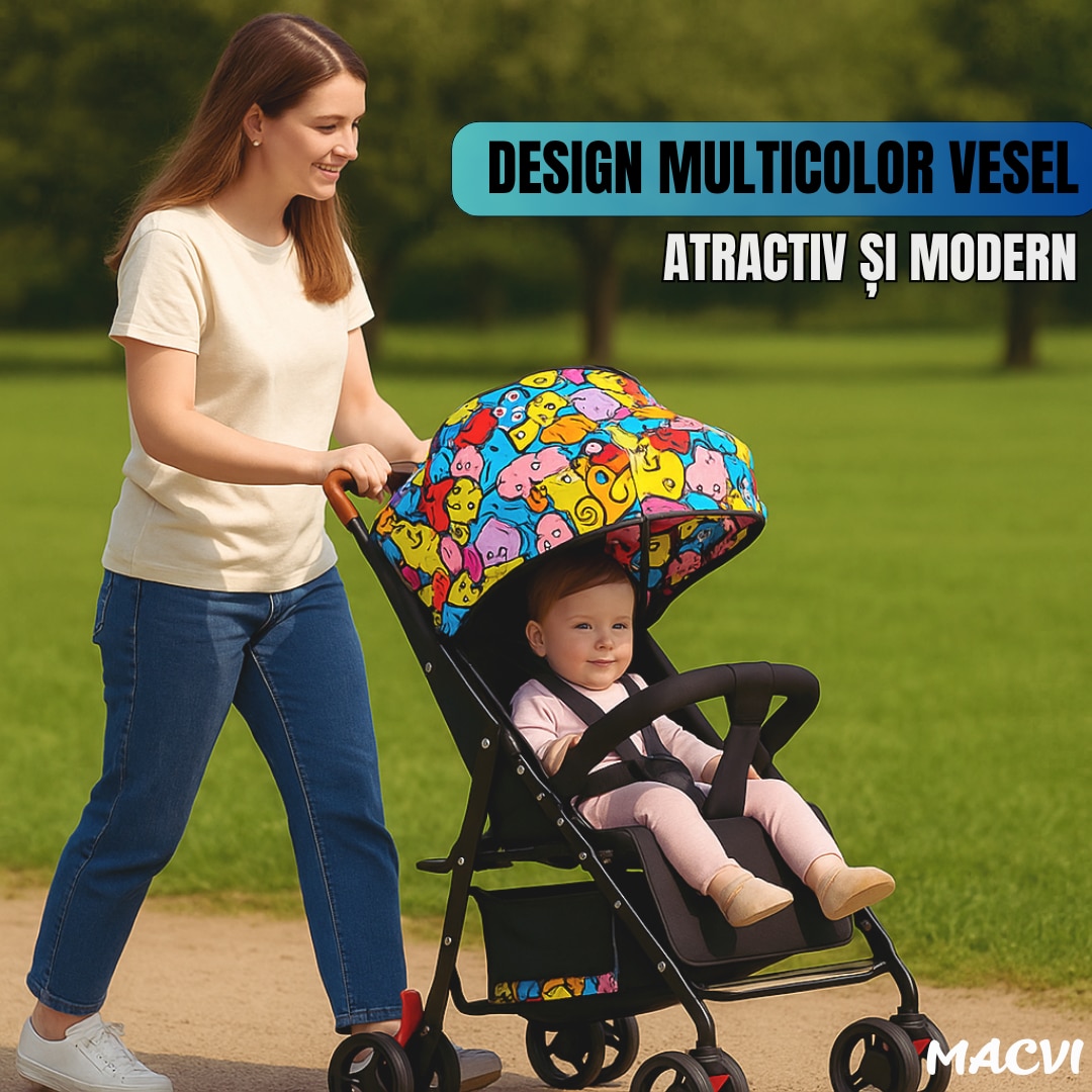 Carucior sport usor Macvi® multicolor pliere rapida copertina UV roti pivotante centura 3 puncte, sistem de franare cu pedala