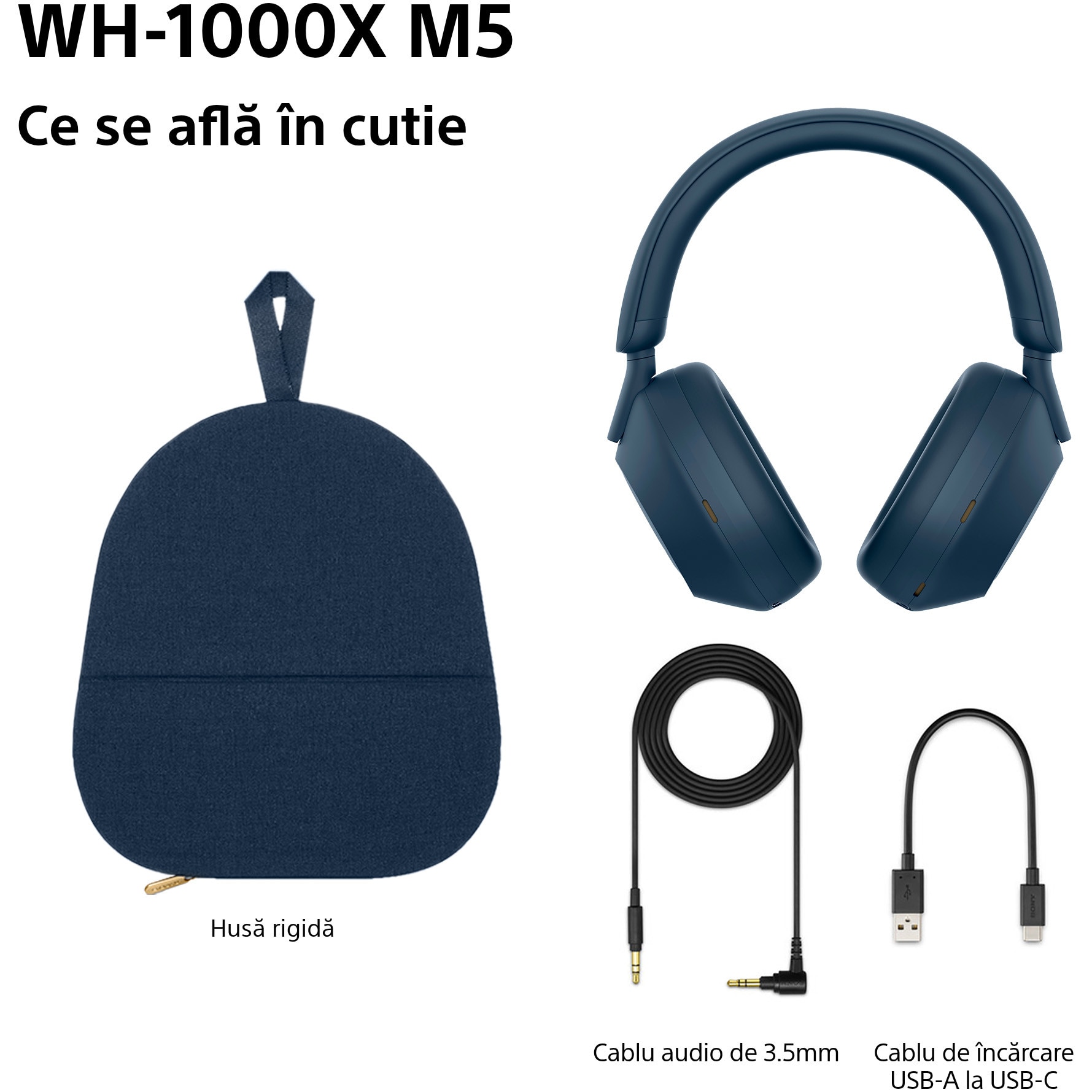Deschideti ambalajul castilor WH-1000XM5 si veti gasi o caseta de transport, un cablu pentru casti (cu lungimea de aproximativ 1,2 m) si un cablu de incarcare USB.