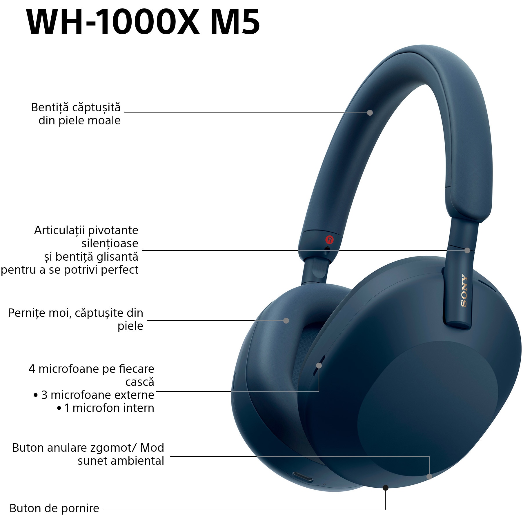 Castile sunt finisate cu piele cu potrivire delicata. Materialul se potriveste perfect, cu mai putina presiune pe urechi si fara sunete externe. WH-1000XM5 sunt o placere gratie designului silentios cu glisor fara trepte, mecanism de pivotare si sistem de agatare fiabile.