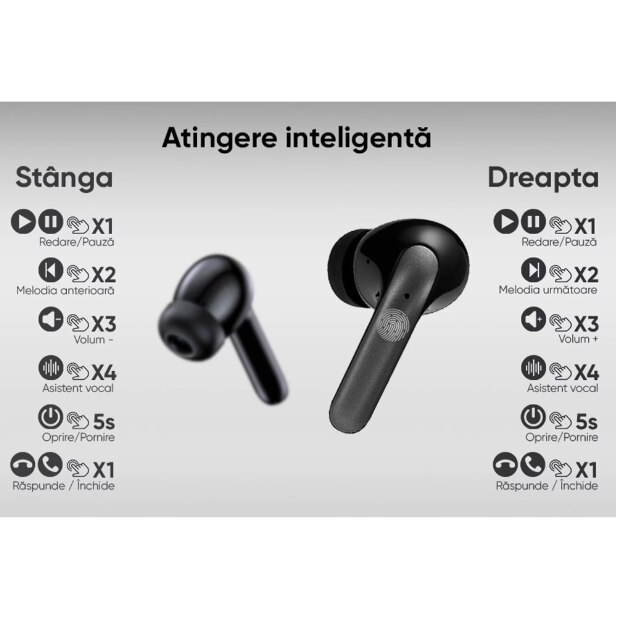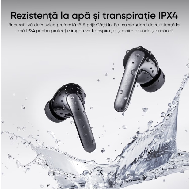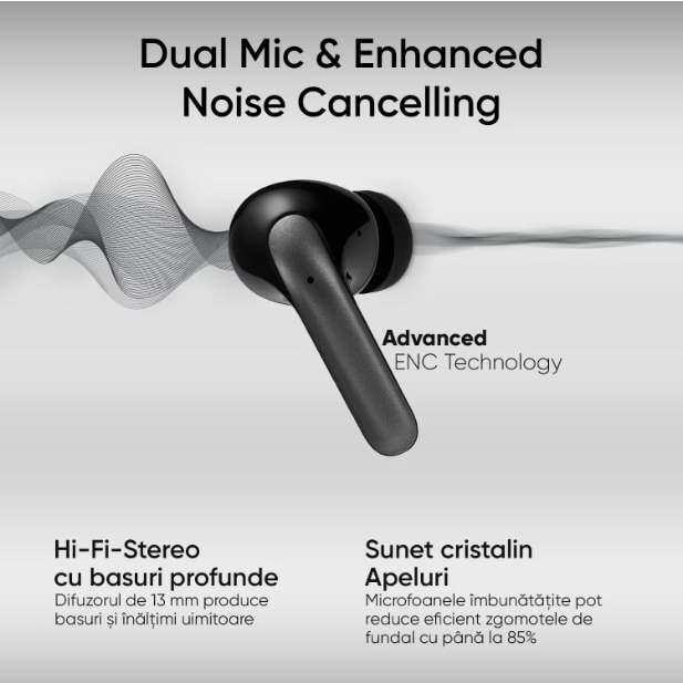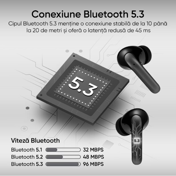 Casti wireless bluetooth cu anularea zgomotului imbunatatita, Audio, Fara fir, Afisaj Digital, Bluetooth 5.3, Autonomie 42 ore, Microfon HD, Control tactil/touch, Latenta de 45 ms, Rezistente la apa, Sport, Compatibilitate Universala, Negru