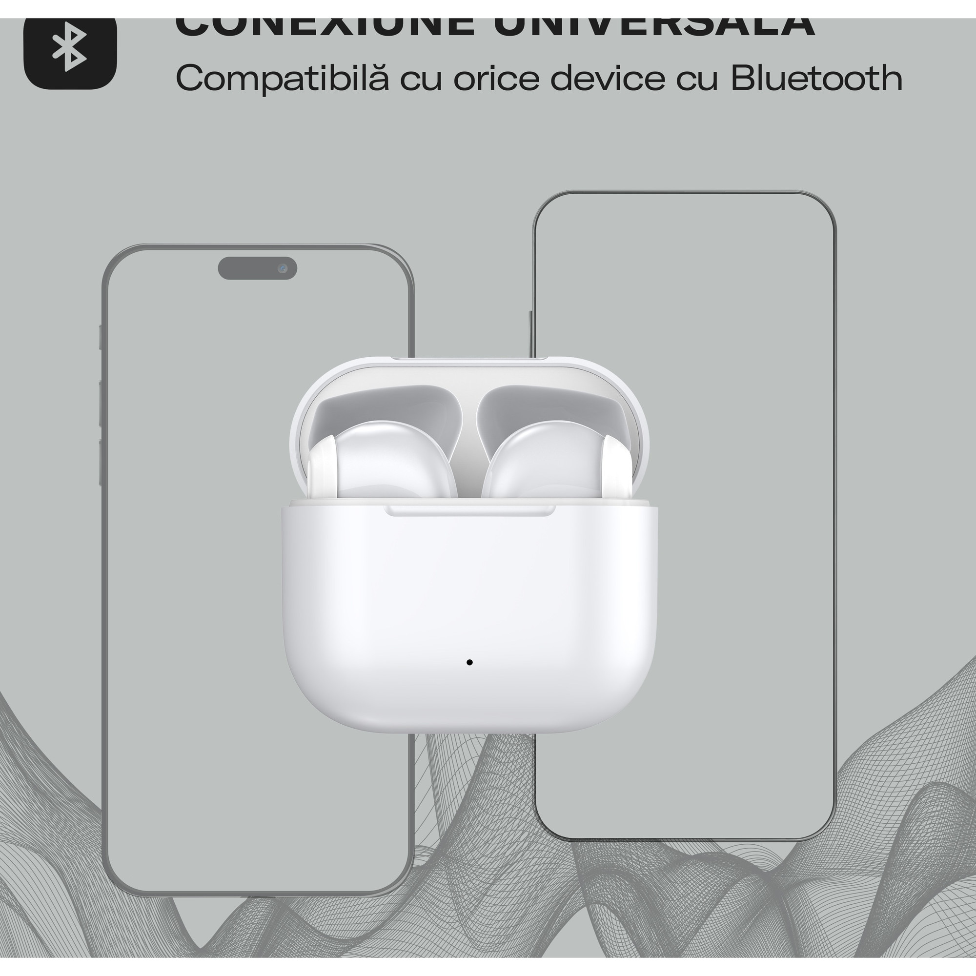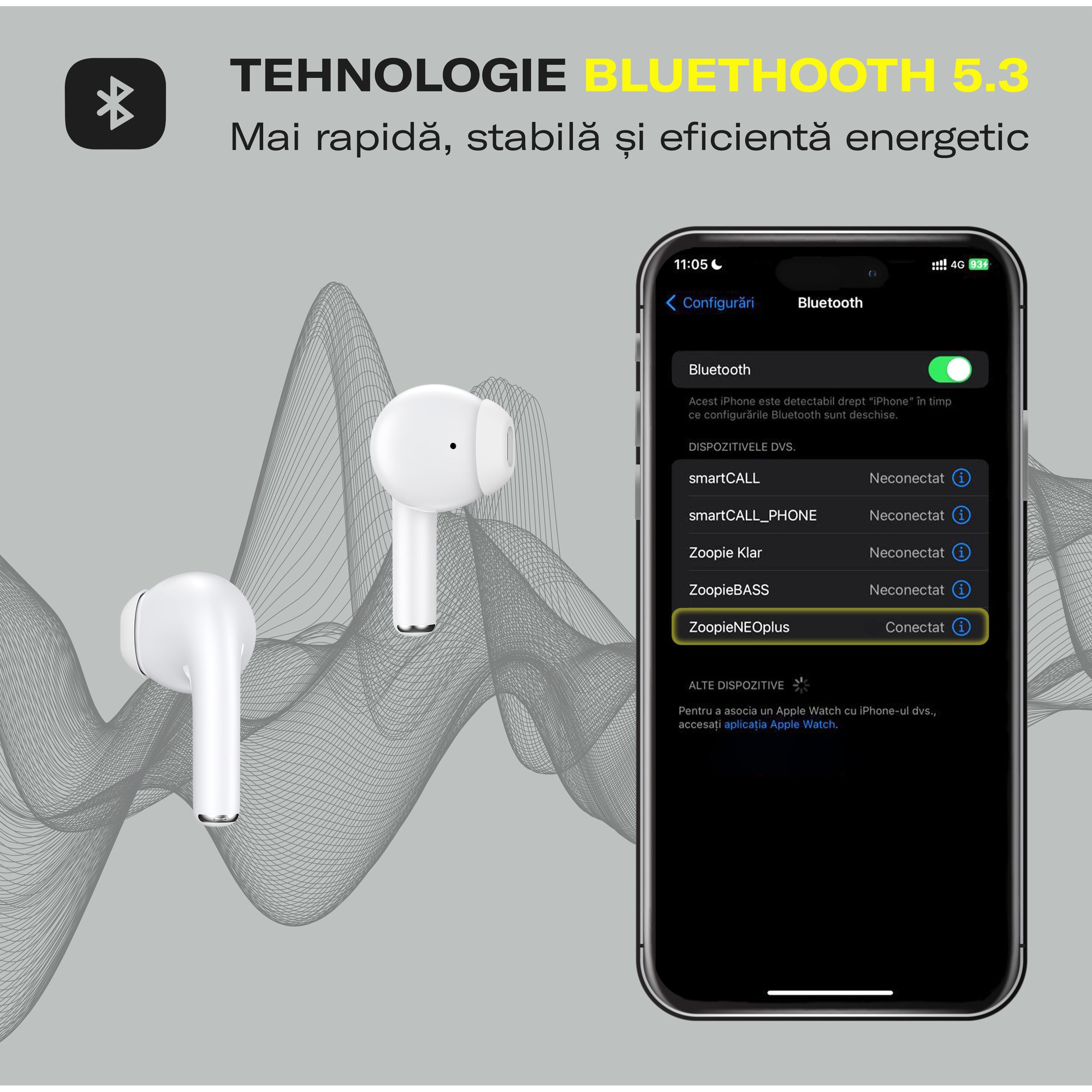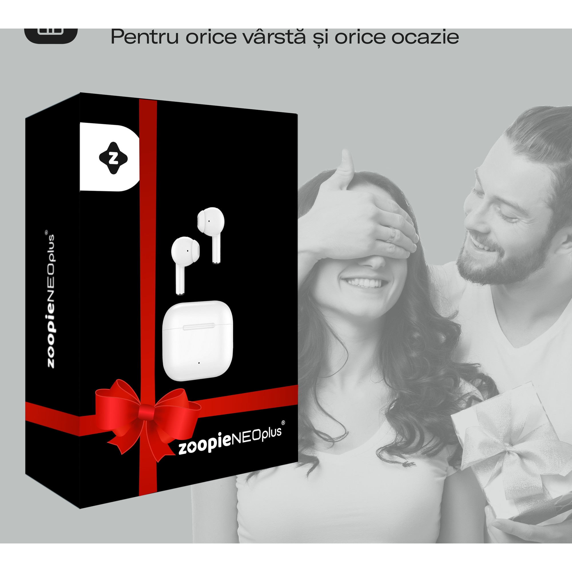 Casti wireless bluetooth, Zoopie®NEOplus, audio, earbuds in ear, fara fir, sport, alergare, cu microfon, casti true wireless, pentru telefon, control touch, asistent vocal, universale, Bluetooth 5.3, alb