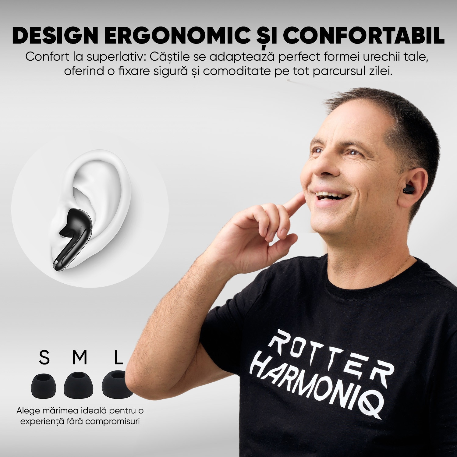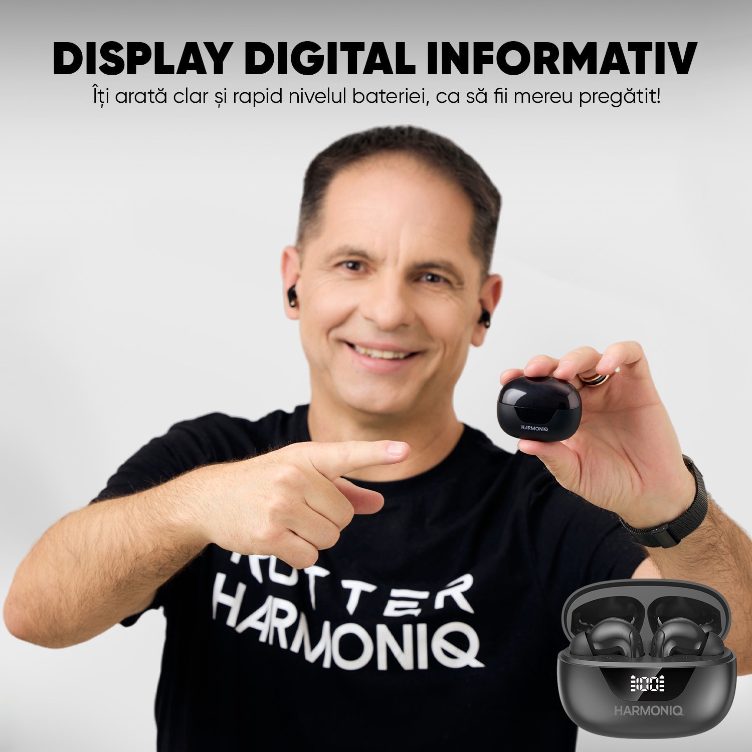 Casti wireless HARMONIQ®️ cu anulare integrala a zgomotului, Casti Bluetooth (ANC+ENC), Casti Audio, Fara fir, in-ear Wireless, Afisaj Digital, Bluetooth 5.4, Autonomie 42 ore, Microfon HD, Control touch, Latenta de 40 ms, IPX4, Sport, Universale, Negru