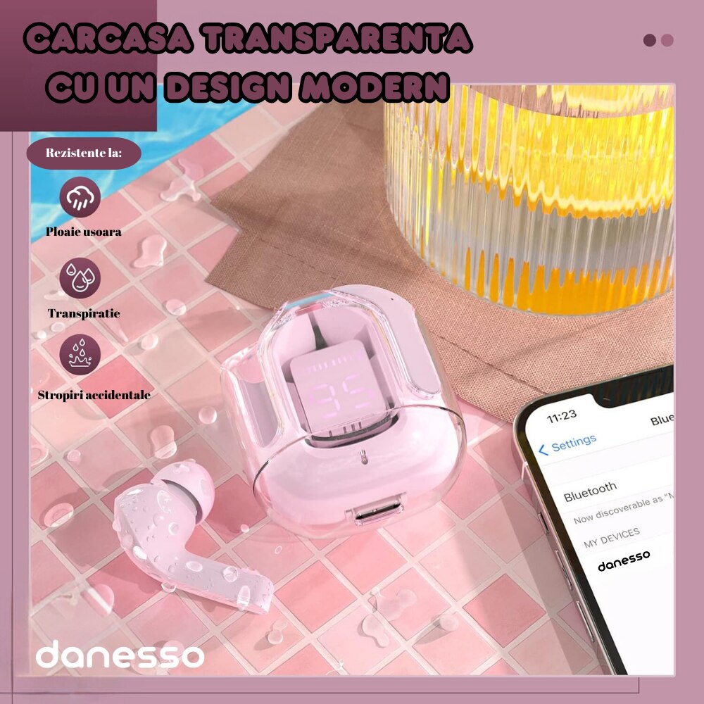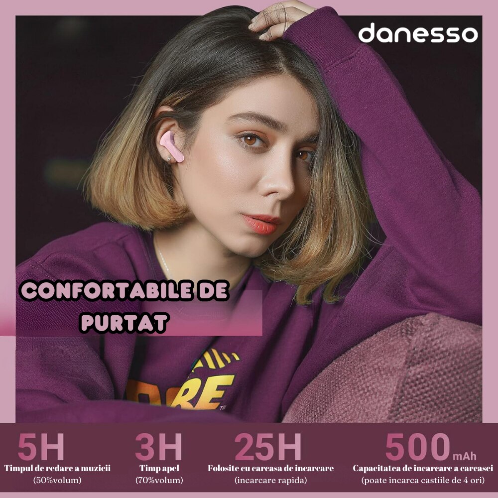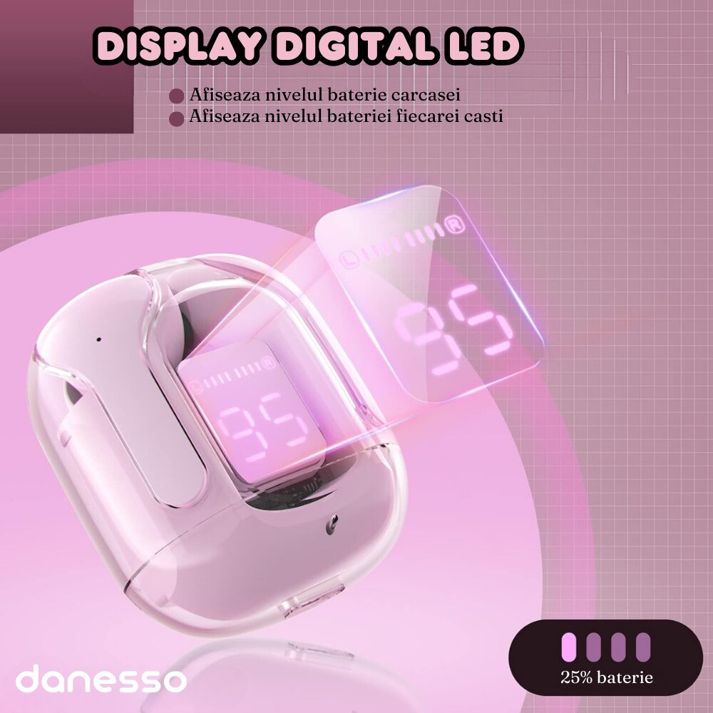 Casti Wireless In Ear, Danesso® Audio, Fara fir, Afisaj Digital LED, Bluetooth 5.0, Microfon Dual, Control Tactil Inteligent, Anulare Zgomot, Rezistente la apa, Sport, Compatibilitate Universala, Roz