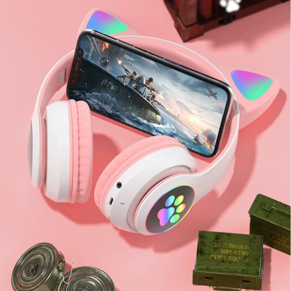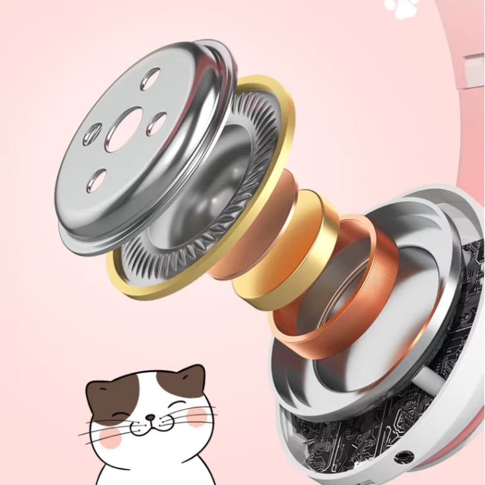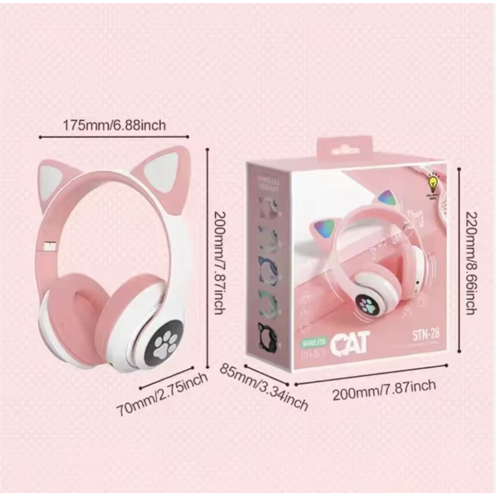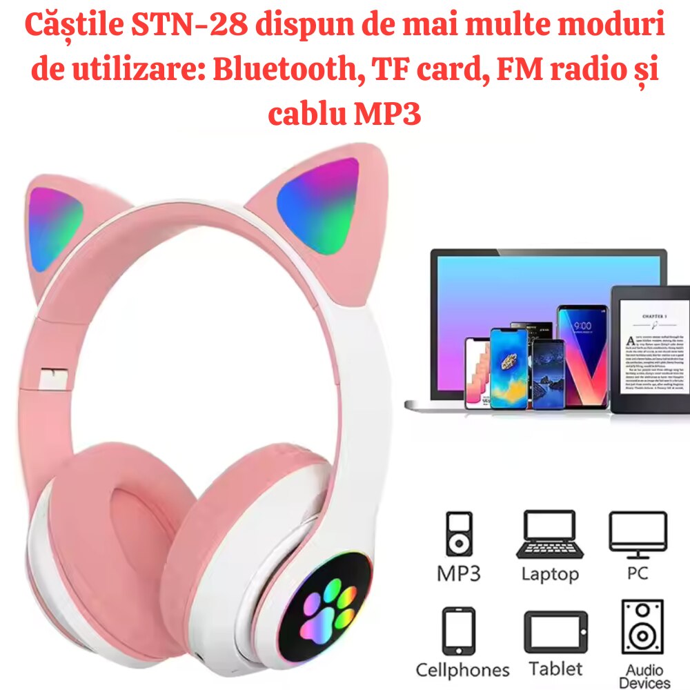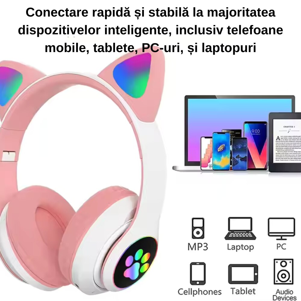 Casti wireless pliabile, Urechi de pisica, casti pentru copii, Lumini LED RGB, Microfon, Bluetooth 5.0, Slot SD, Reducere Zgomot, Baterie 400mAh, culoare roz +