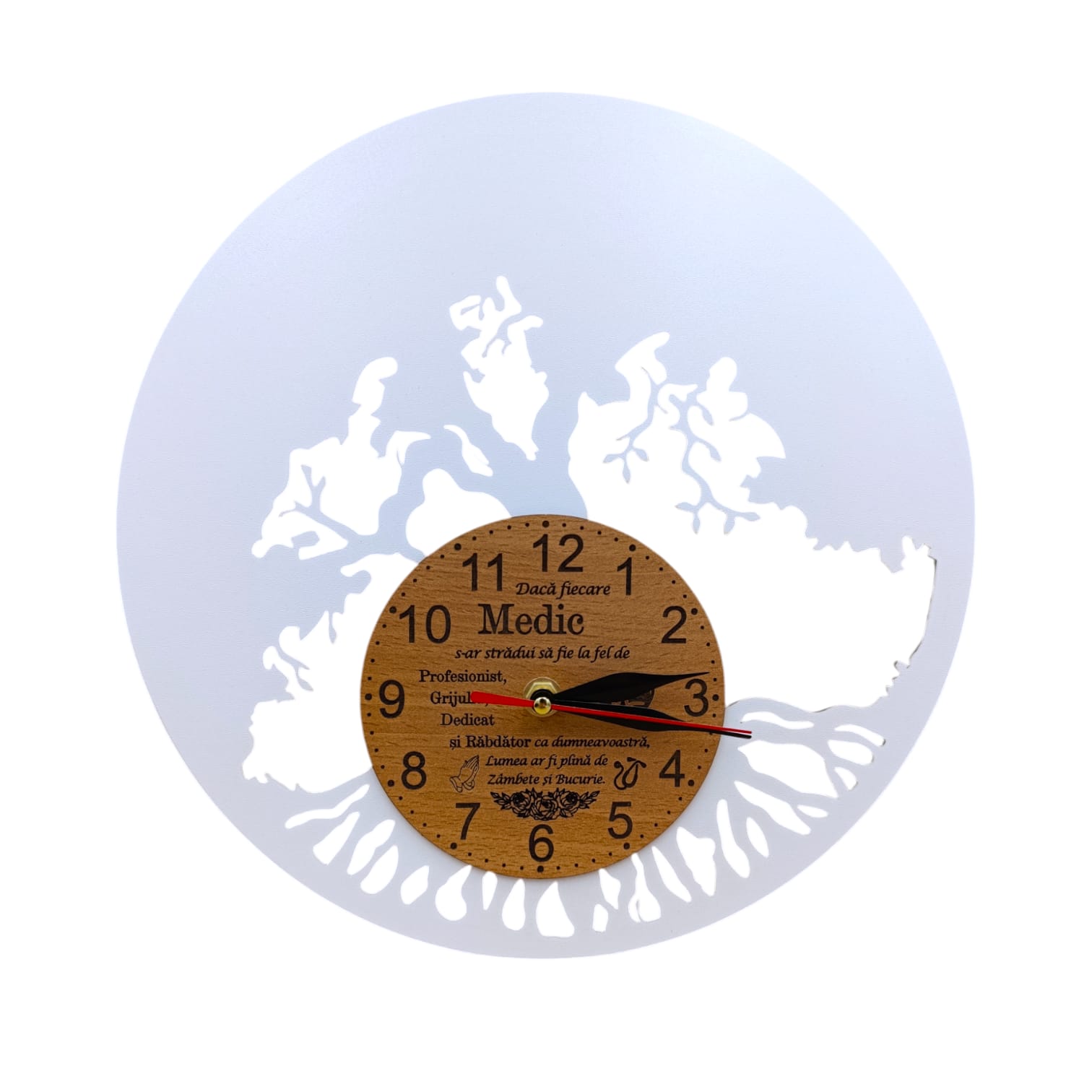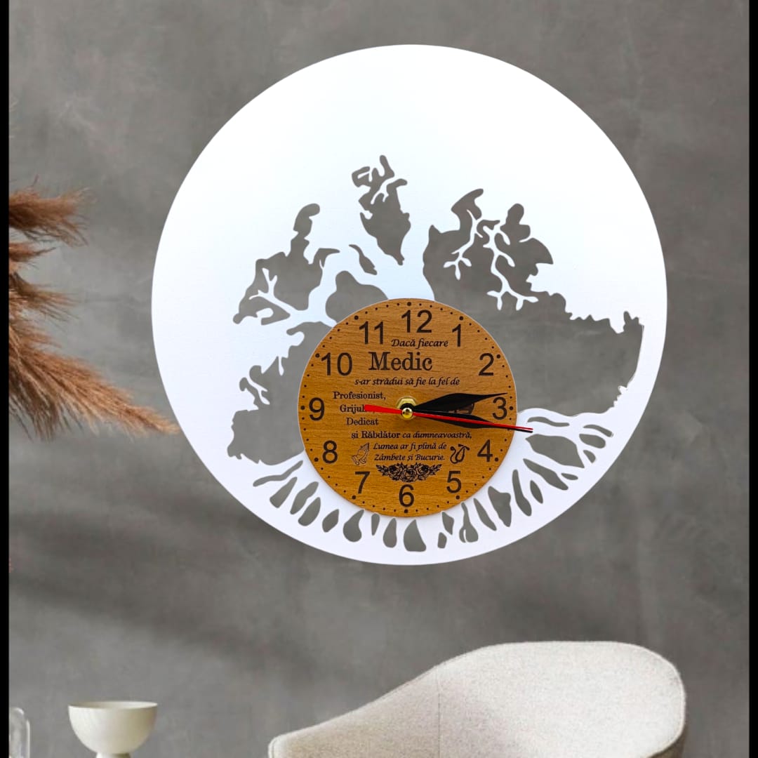 Ceas de perete blank pentru licheni naturali stabilizati, cadou personalizat cu mesaj standard pentru "Medic" 60cm, alb