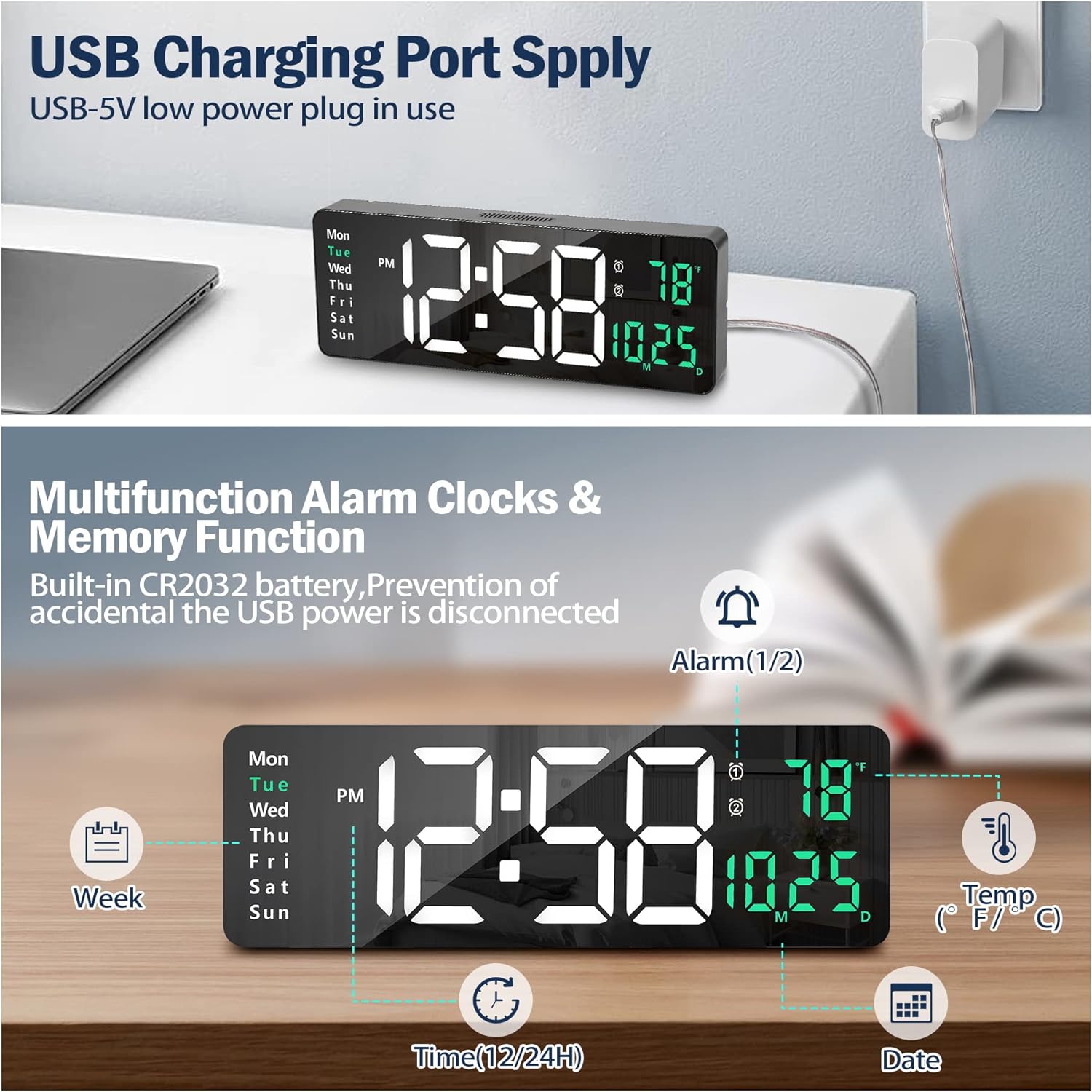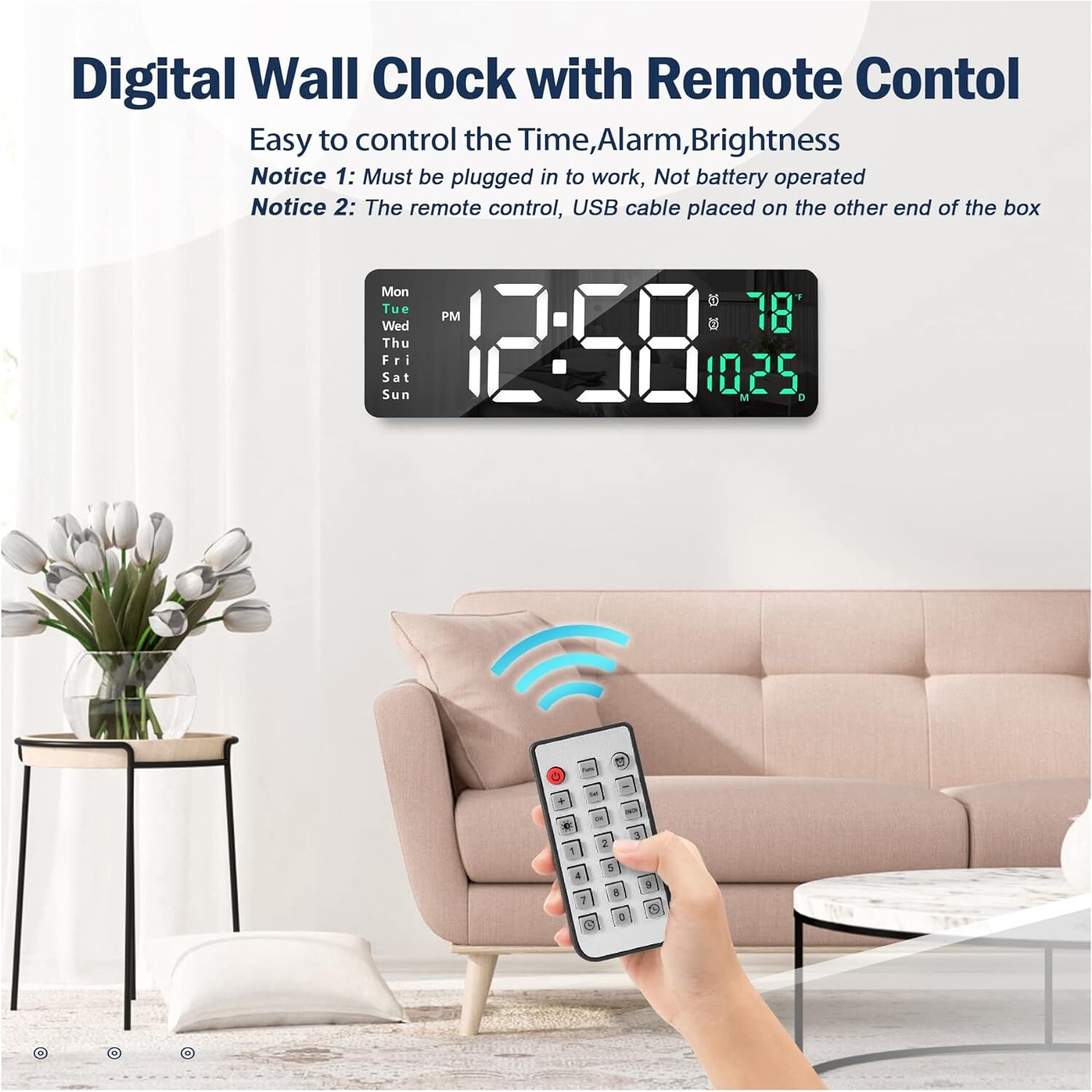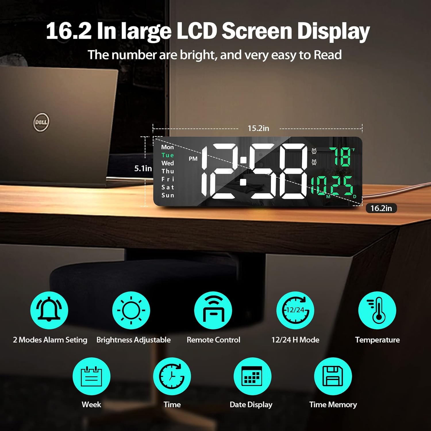 Ceas digital de perete, afisaj LED mare 16.2 inch, functie alarma si cronometru, ajustare luminozitate, negru