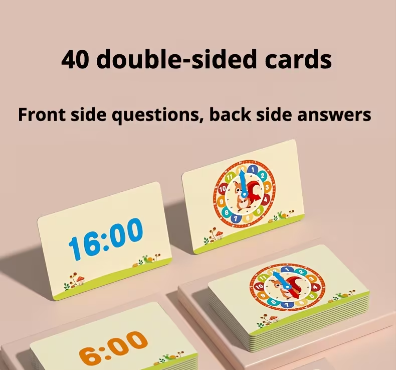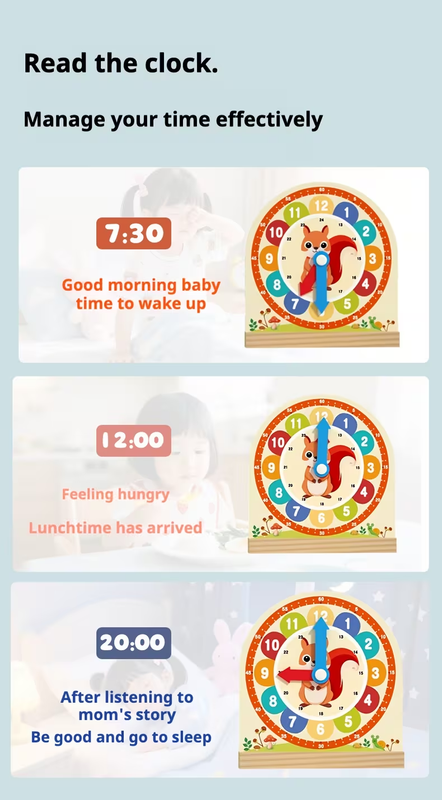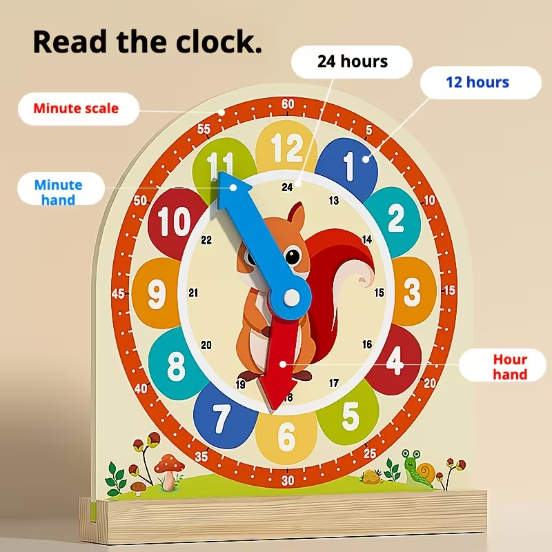 Ceas din lemn cu veverita, JALWO, jucărie educațională, recunoașterea cifrelor, 17x15cm