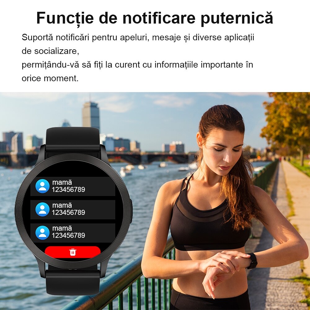 | Functii | Alarm clock Calendar Vreme Calculator Functie nu deranja Control muzica Ritm cardiac Alerta sedentarism Cautare telefon Apeluri Bluetooth Asistent vocal Declansator camera foto Somn Activitate fitness Ciclu menstrual Stres Meniu limba RO | EN Notificari (SMS, Calendar, Email, Gmail, Apeluri pierdute, Facebook, X, Instagram, WhatsApp, WhatsApp Business, Messenger, LinkedIn, Skype, Telegram, Youtube, Pinterest, TikTok) Contacte favorite Antrenamente SpO2 Exercitiu de respiratie |