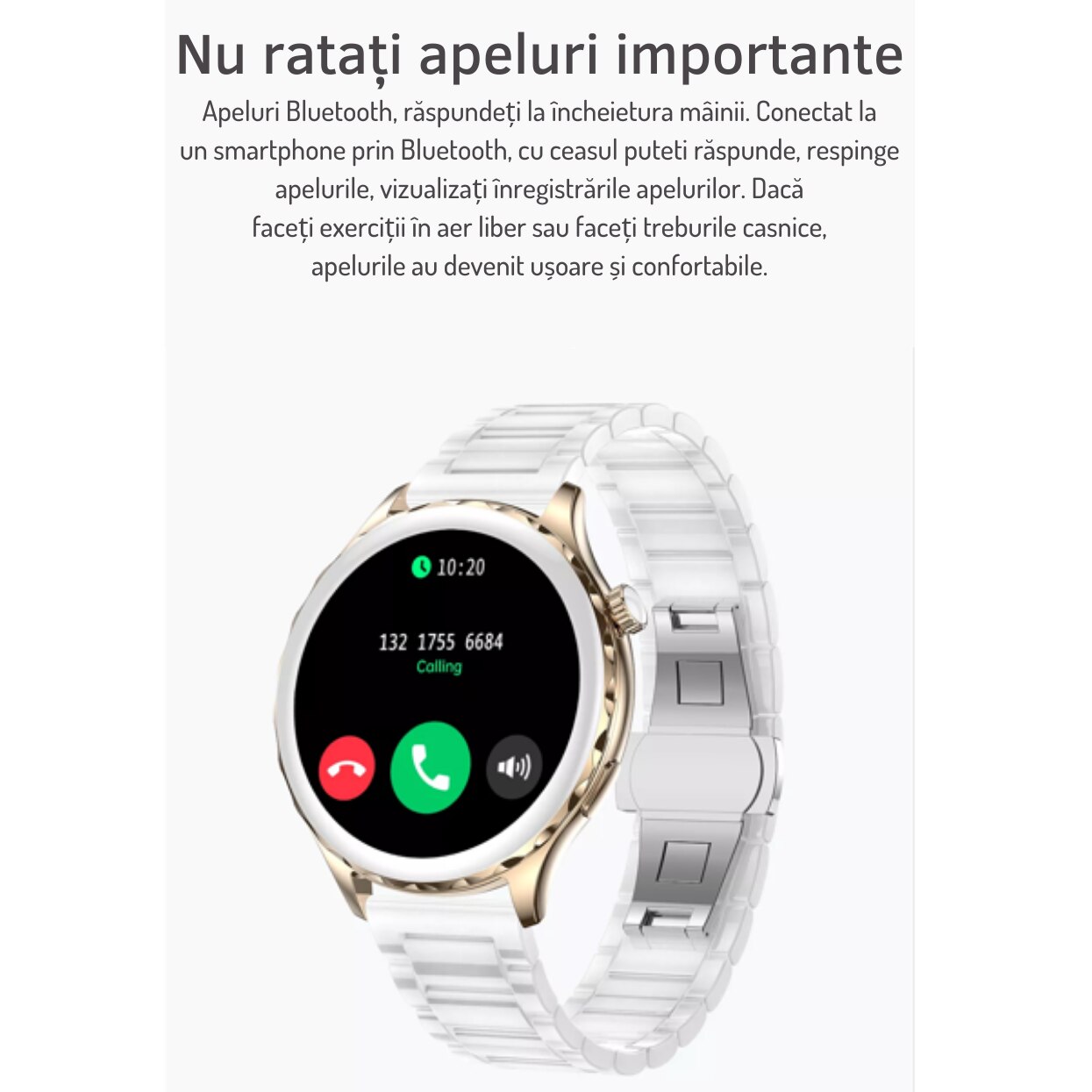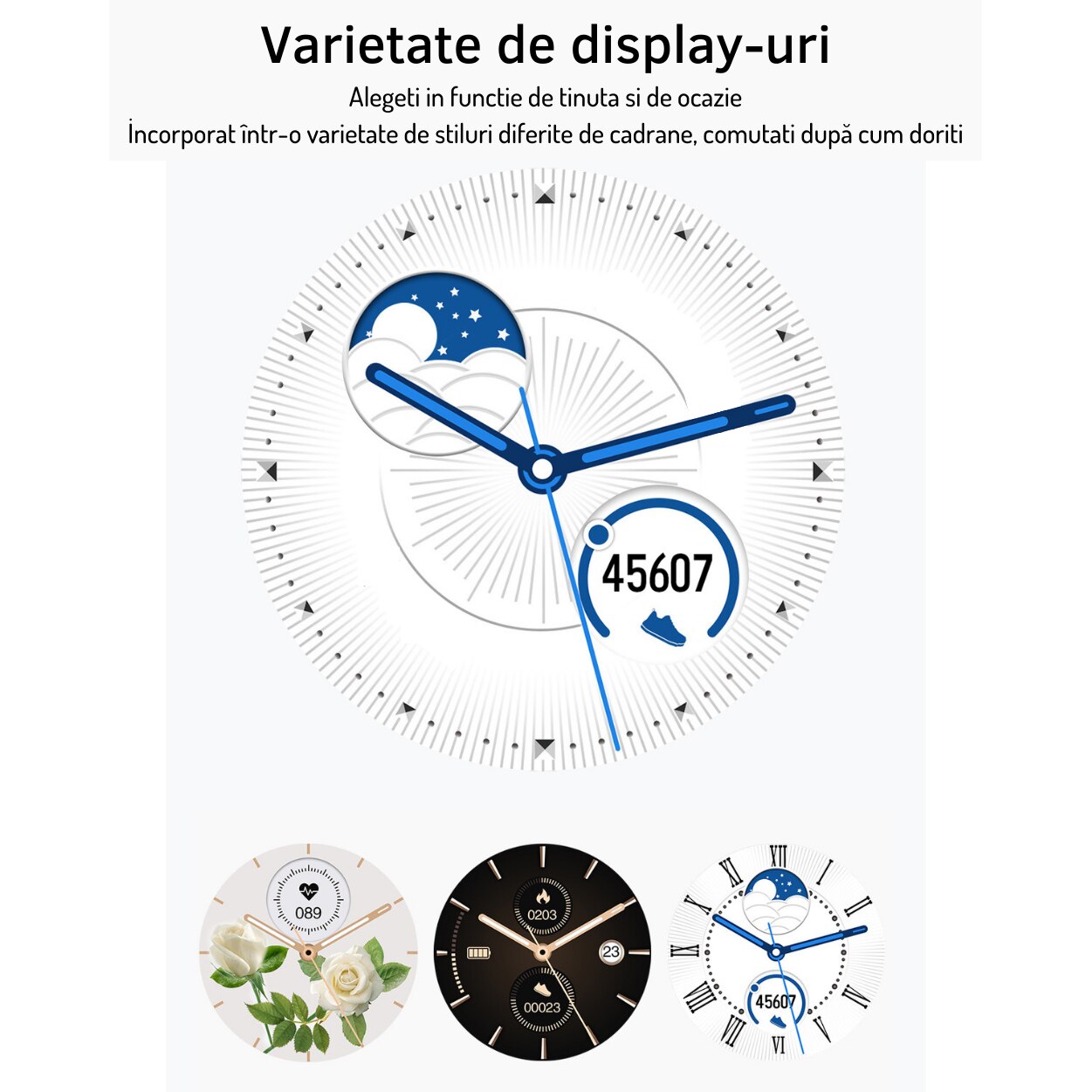 | Informatii suplimentare | Afisaj deosebit A se evita lovirea, zgarierea, contactul cu alcool, parfum, acetona, detergent, suprafete abrazive. Faceti fotografii cu telefonul apasand butonul de pe ceasul inteligent Curele inlocuibile |