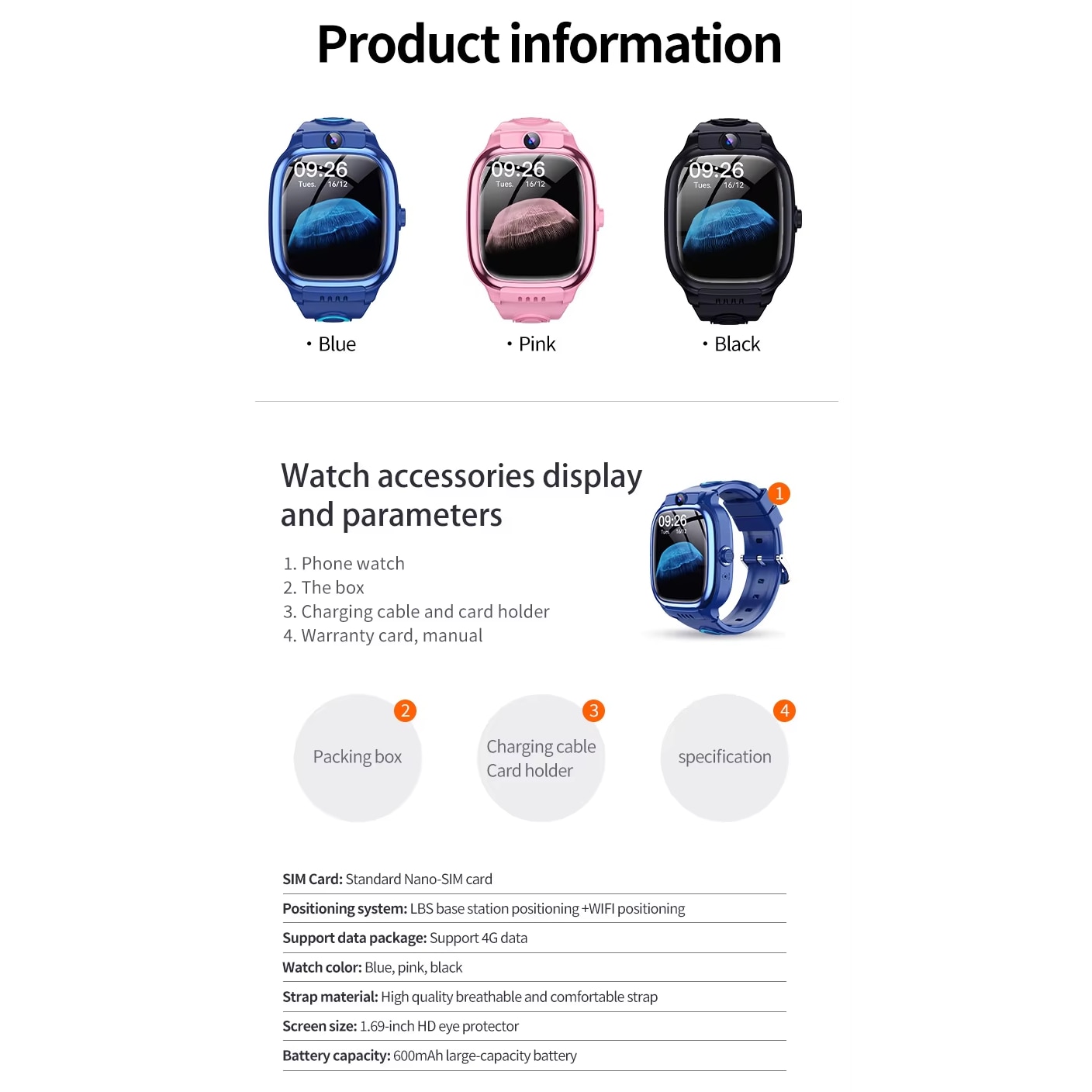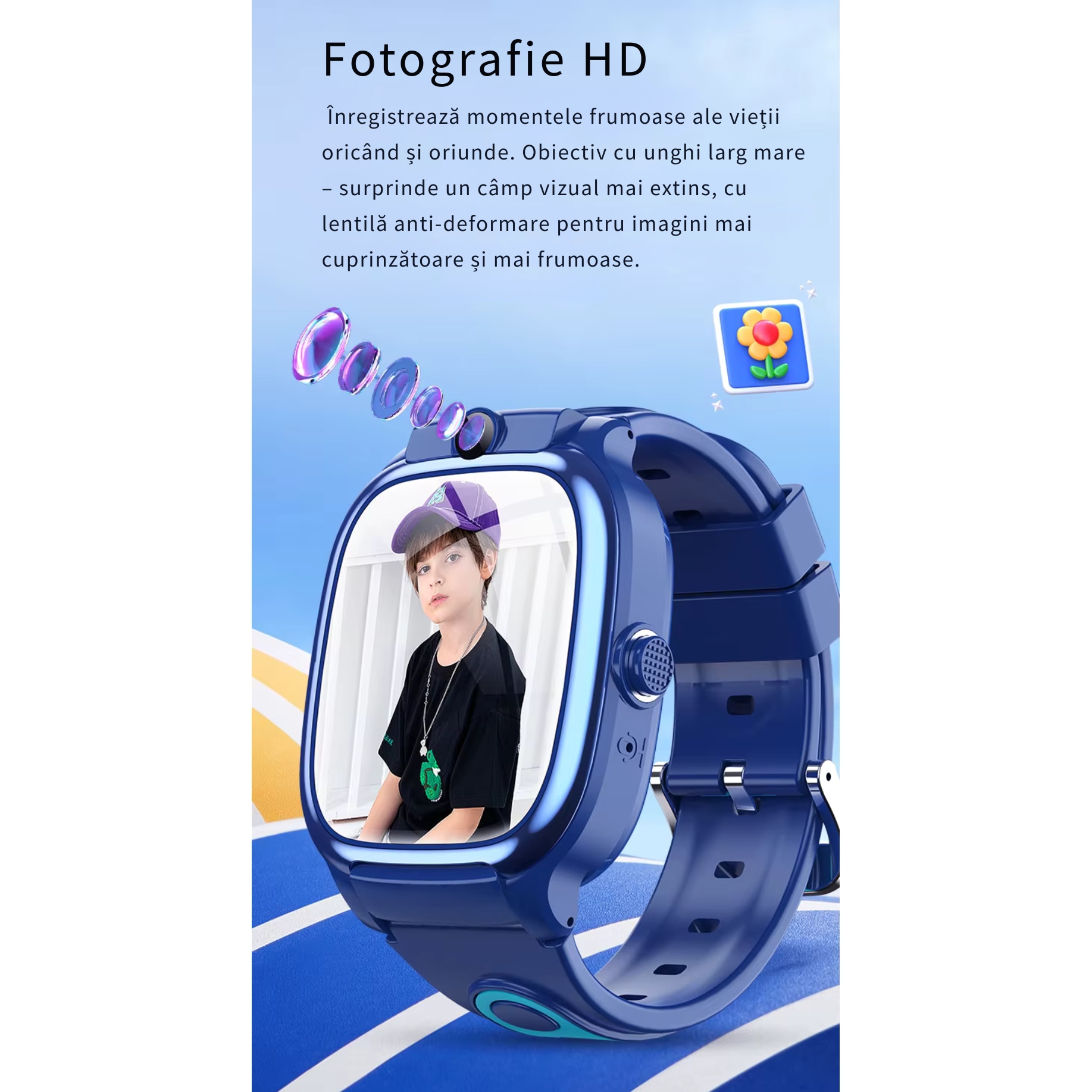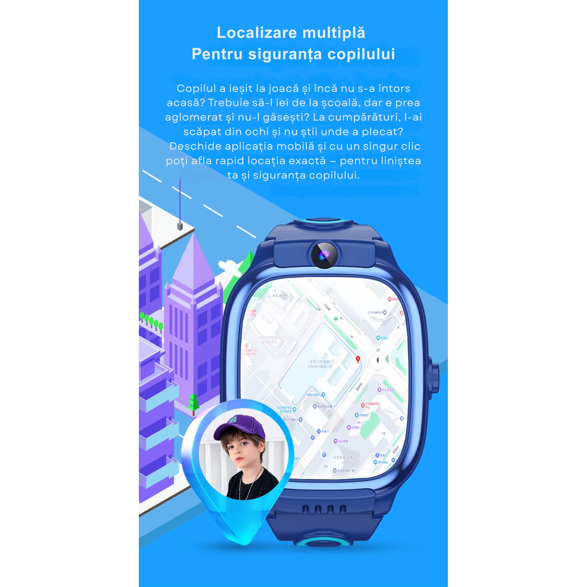 Localizare LBS + WiFi – Ceasul este dotat cu functie de localizare prin tehnologie LBS si WiFi, care permite determinarea aproximativa a pozitiei copilului in lipsa GPS-ului. Precizia poate varia in functie de zona si semnal, cu o marja de eroare de cateva sute de metri pana la cativa kilometri. Este o solutie utila pentru monitorizare generala si aproximativa, mai ales in zone urbane.