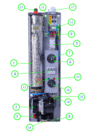 | Functii | Incalzire Termostat ajustabil Termometru Protectie supraincalzire Supapa de siguranta Vas de expansiune Pompa low energy Erp Senzor de presiune Posibilitate de conectare la un sistem solar Senzor de temperatura Afisaj temperatura Pompa de circulatie Modulare putere electrica Manometru Conexiune Wi-fi optionala |