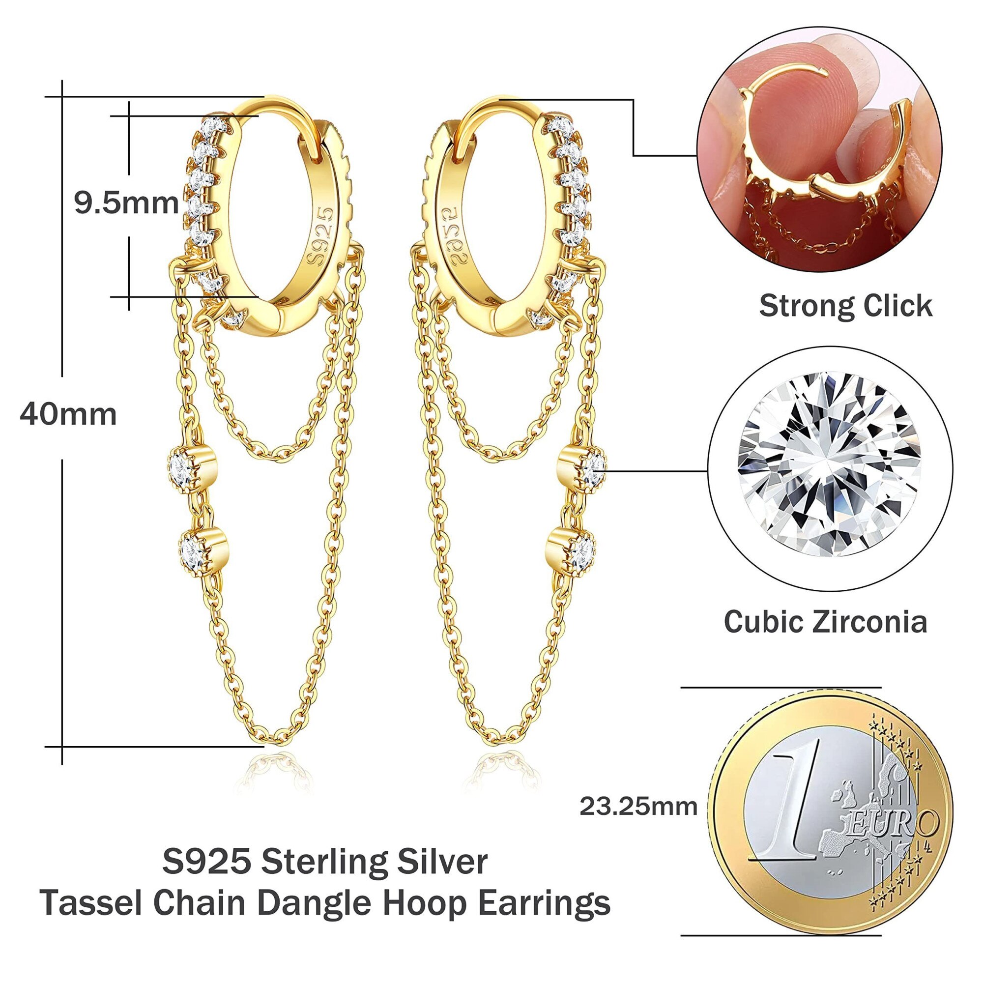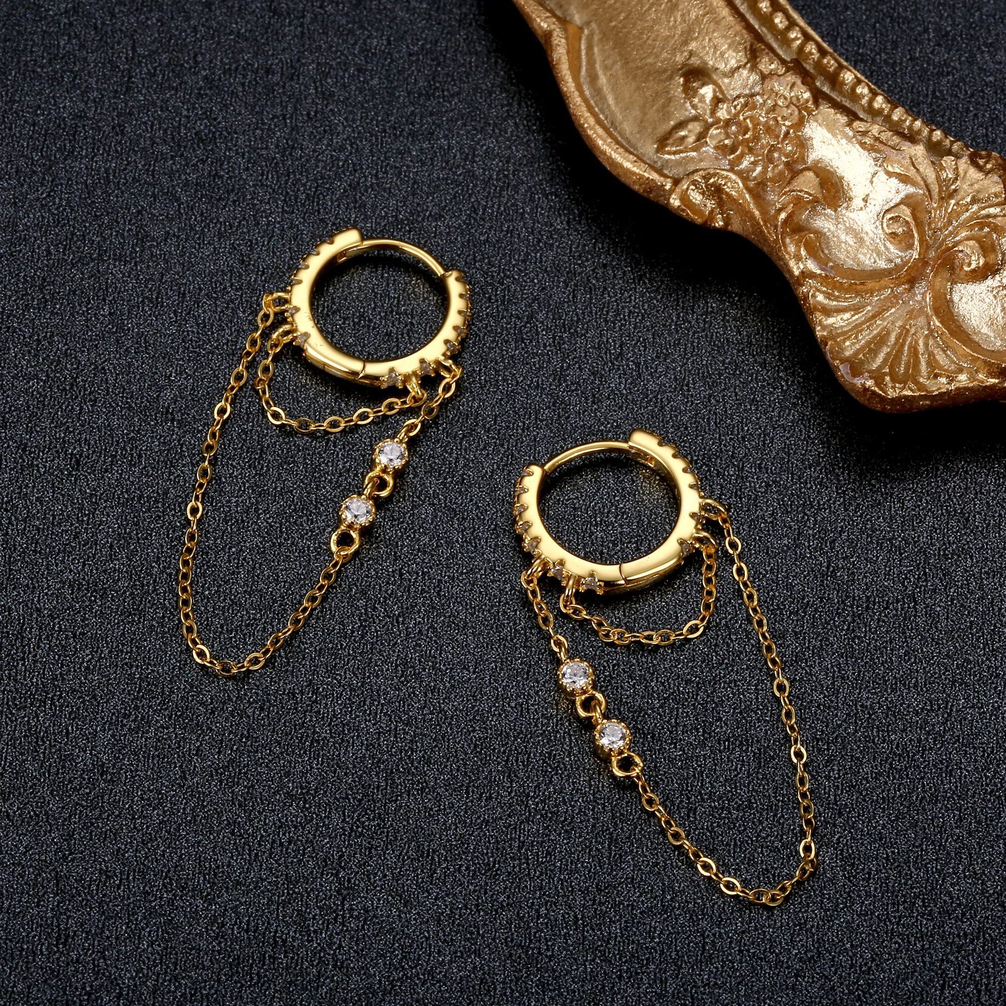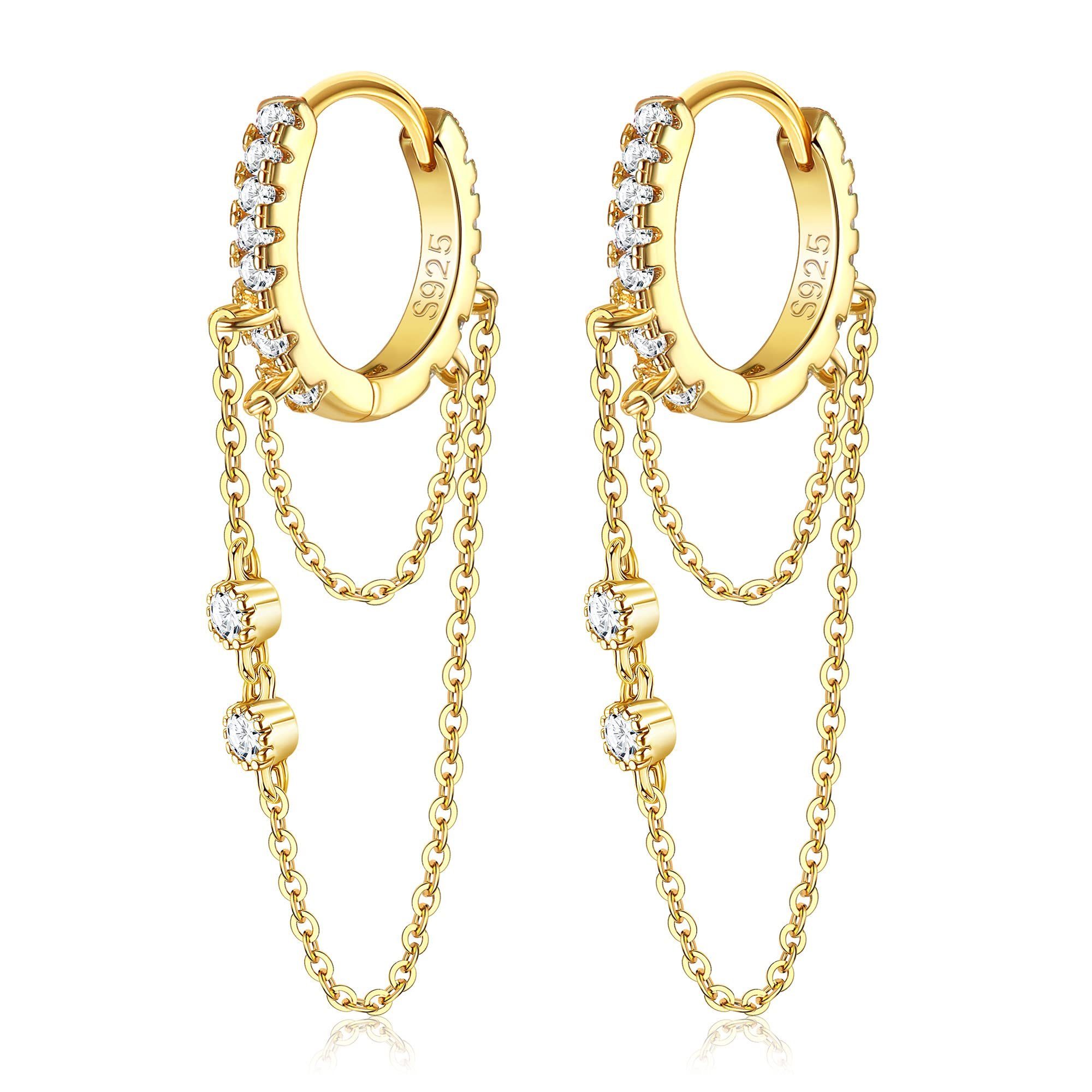 Cercei din argint 925, lant dublu, zirconiu, auriu colorat, pentru femei