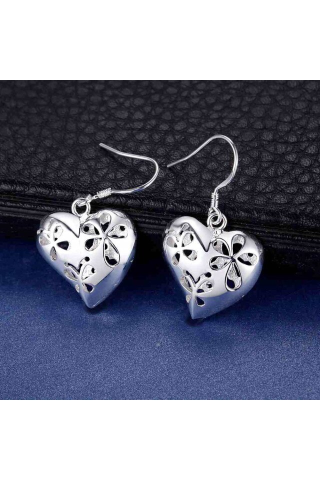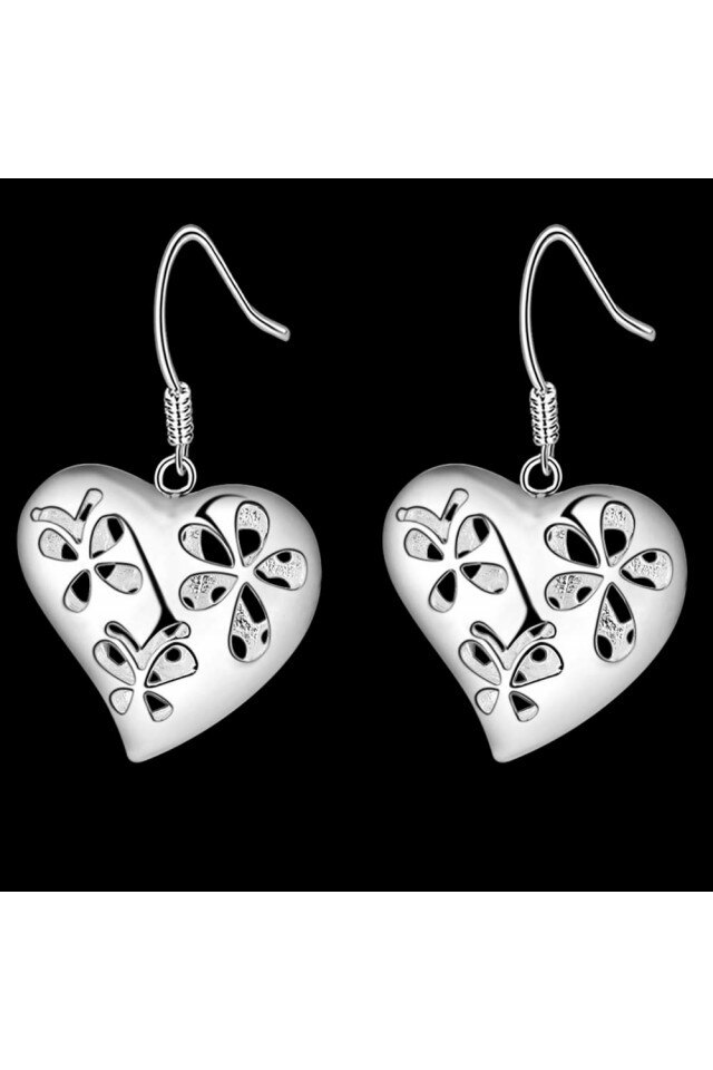 Cercei Placati cu argint, inimi cu 2 fete, cu flori, fluturi si inimioare, Argintiu