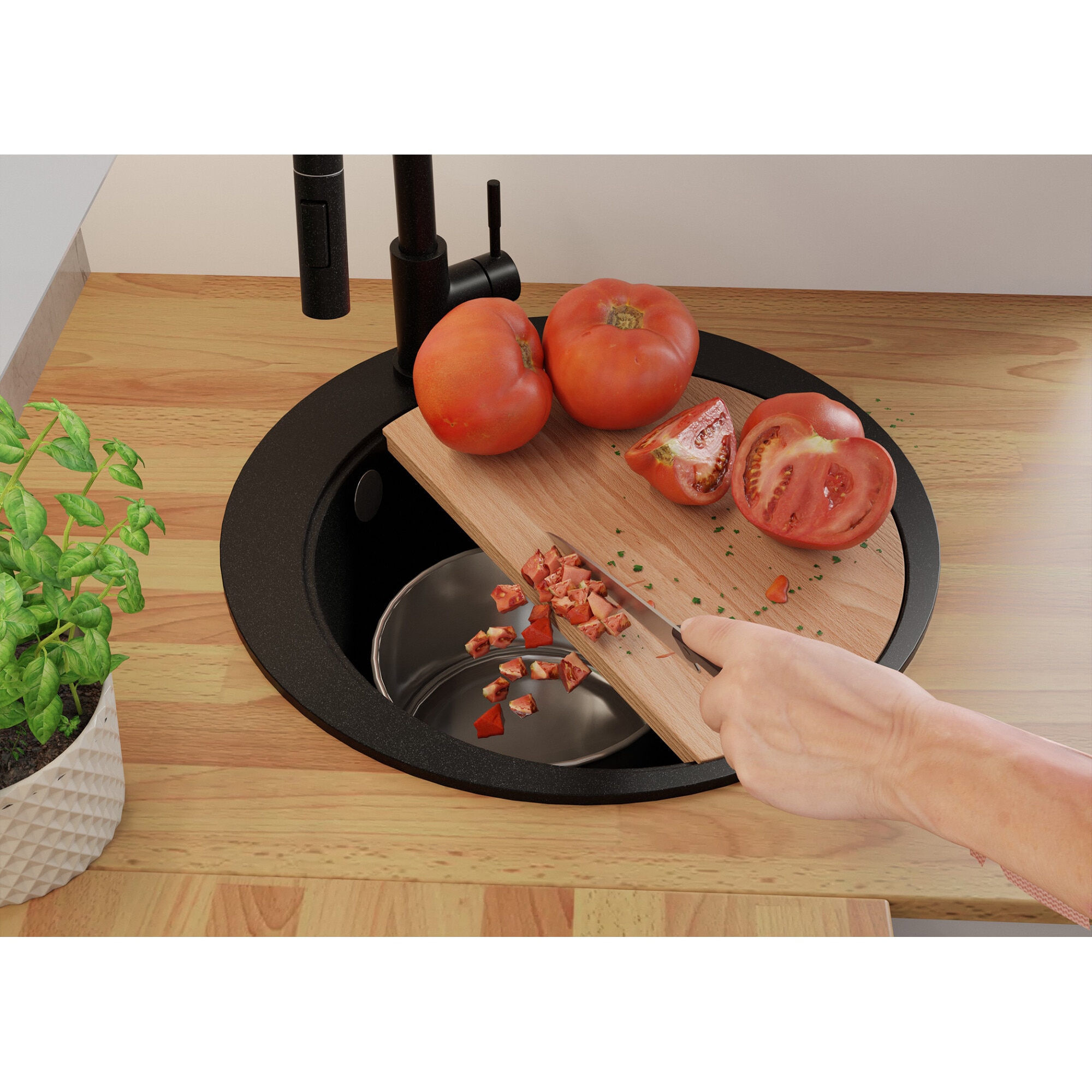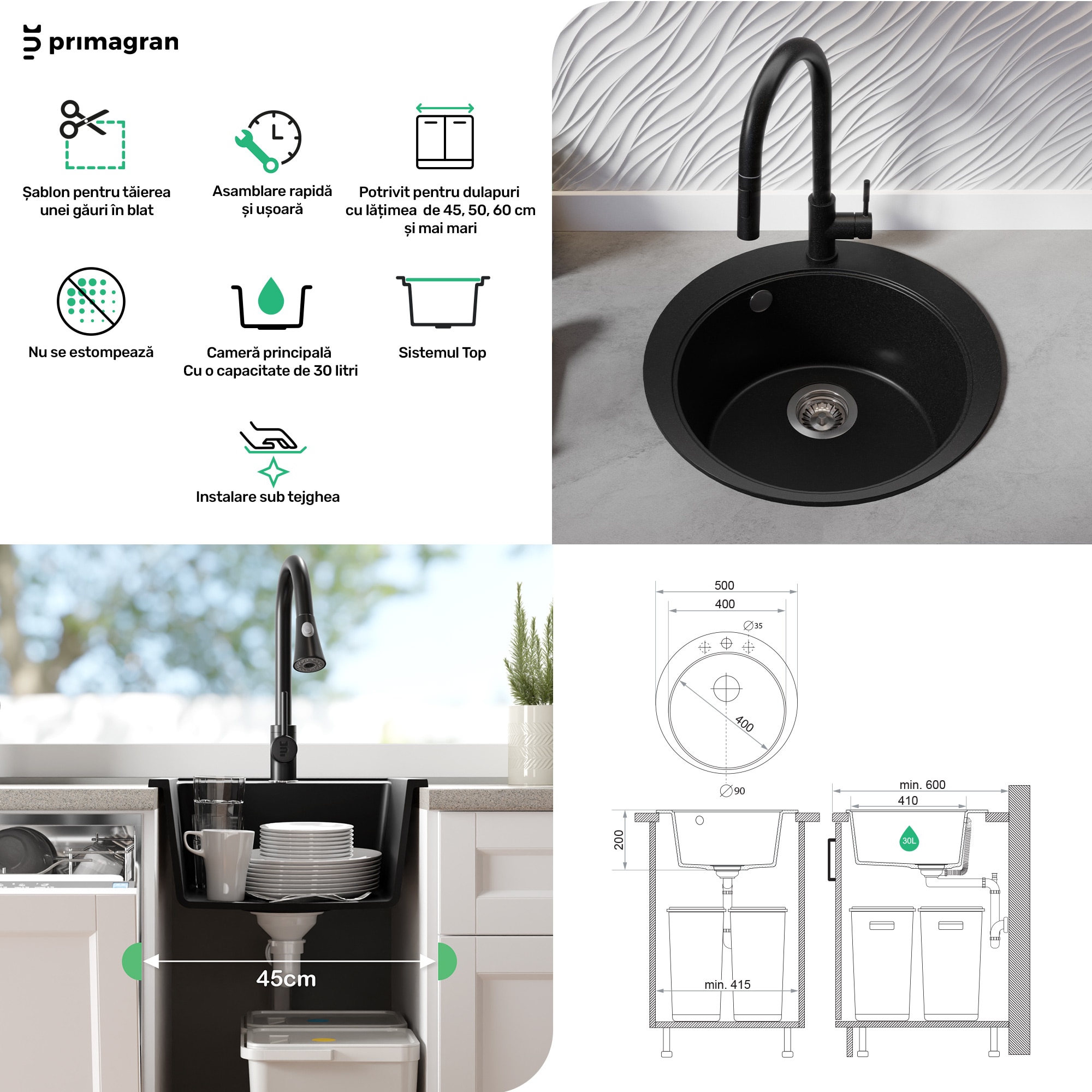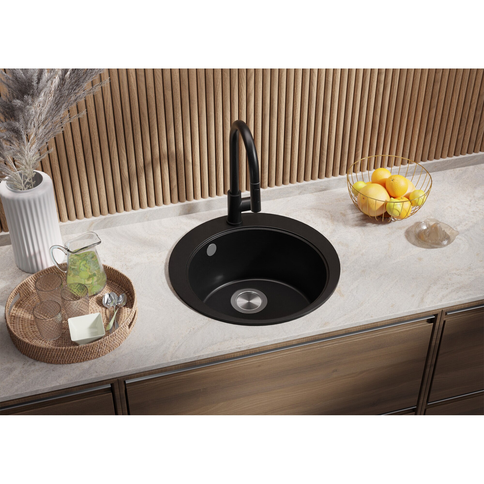 Chiuveta de bucatarie rotunda din granit 50x50cm, Chiuveta 1 Cuva + Sifon + Placa, Pentru dulap de 45cm, Pisa Top Primagran Negru
