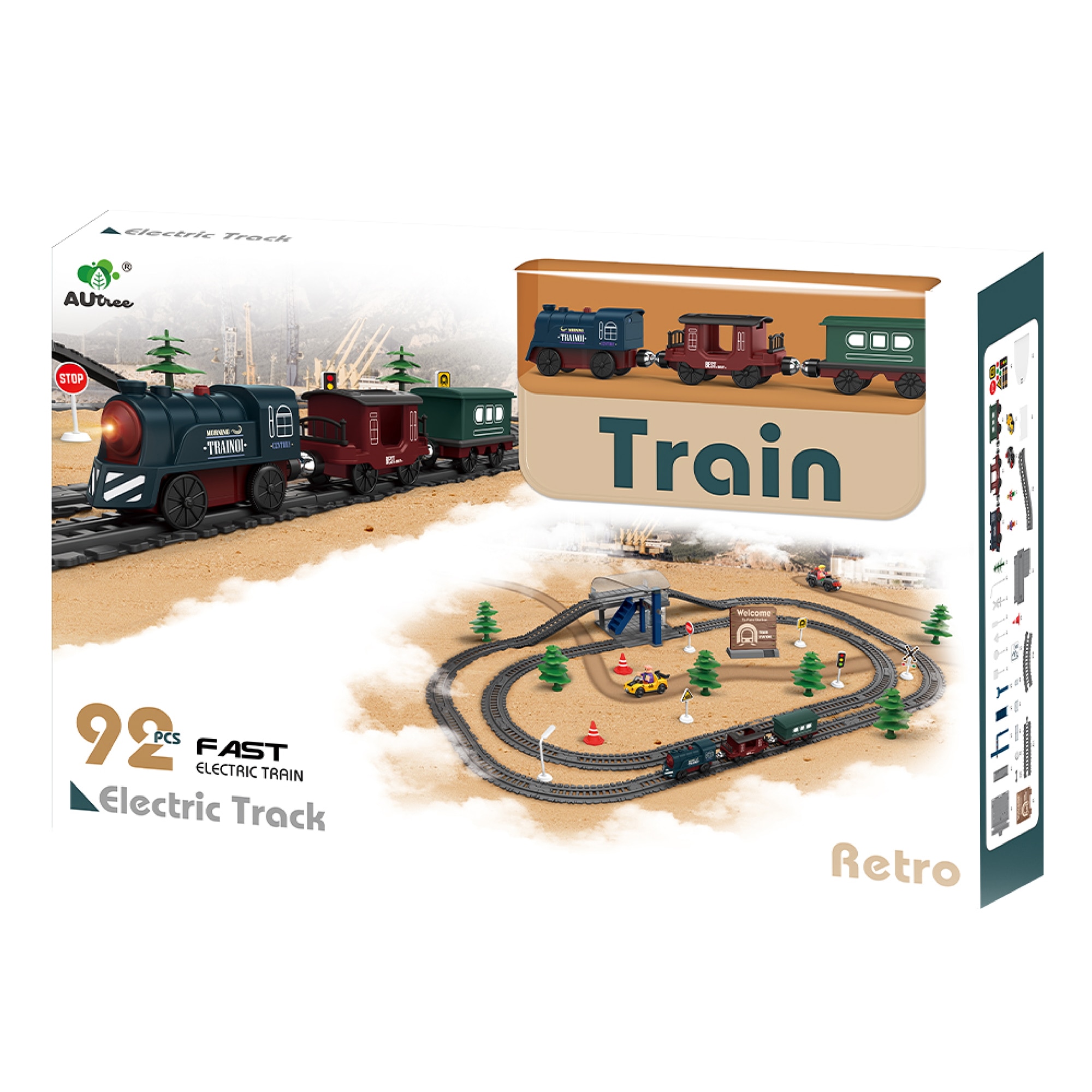 Circuit tren electric cu lumini si sunete, Mappy Retro cu accesorii, 92 piese