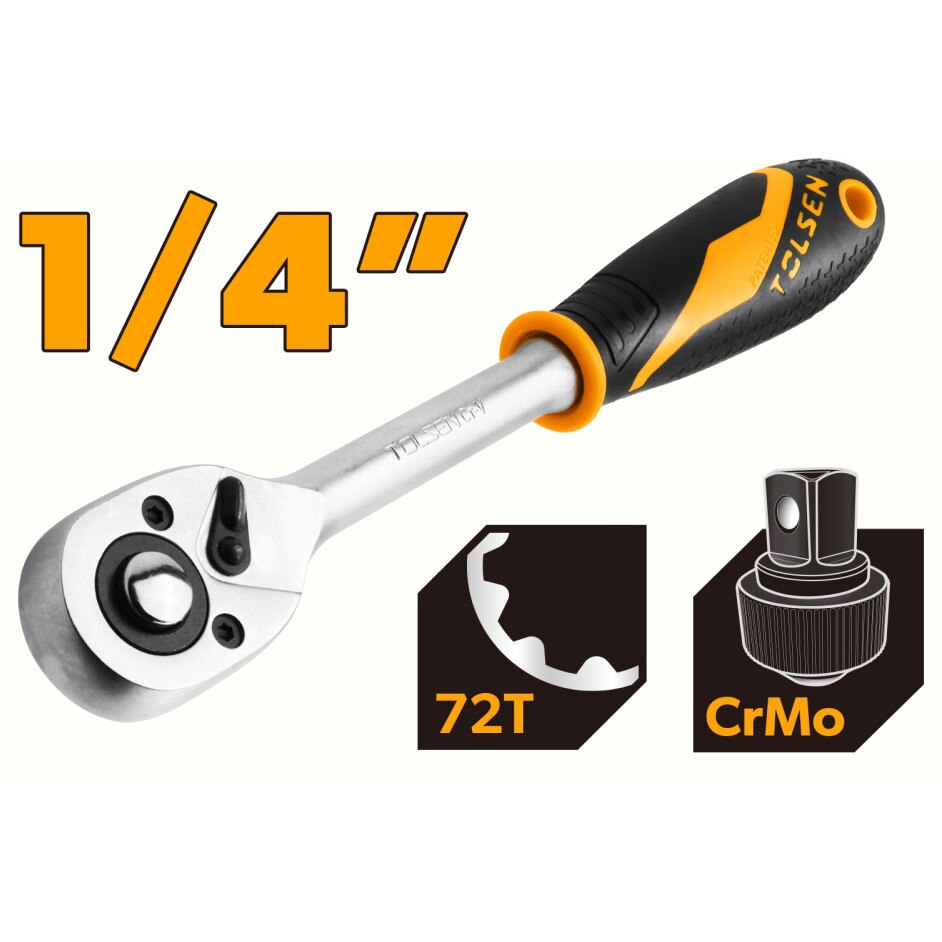 Clichet reversibil TOLSEN Industrial 1/4", Cr-Mo, 72 dinti, maner ergonomic 2 componente, finisaj crom mat, pentru prindere sigura si utilizare intensiva