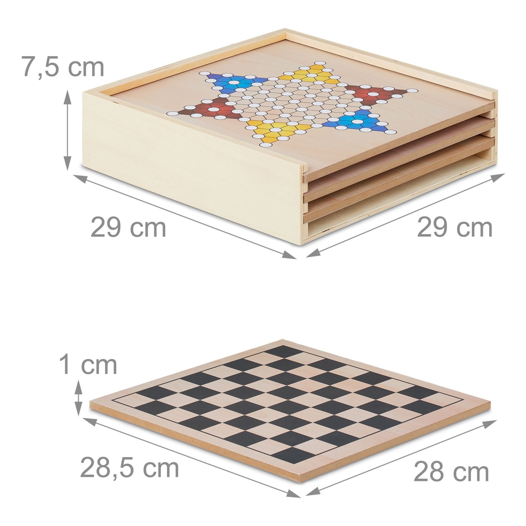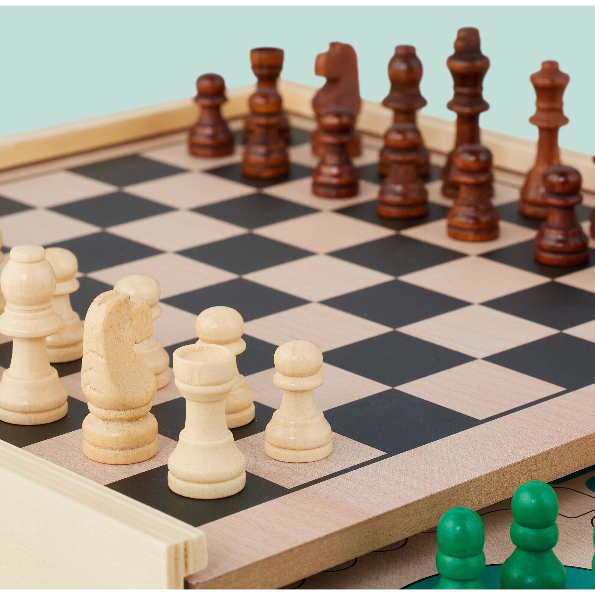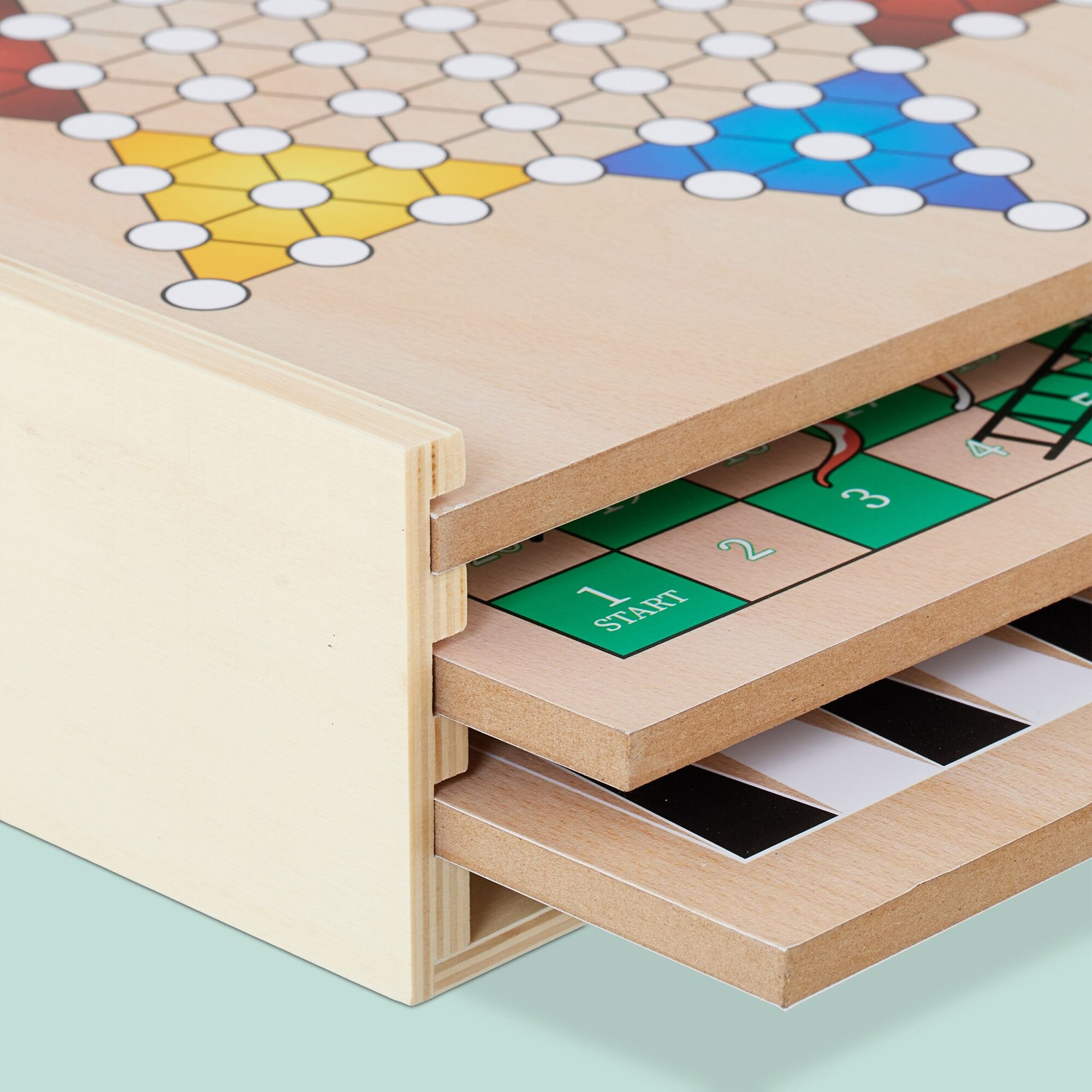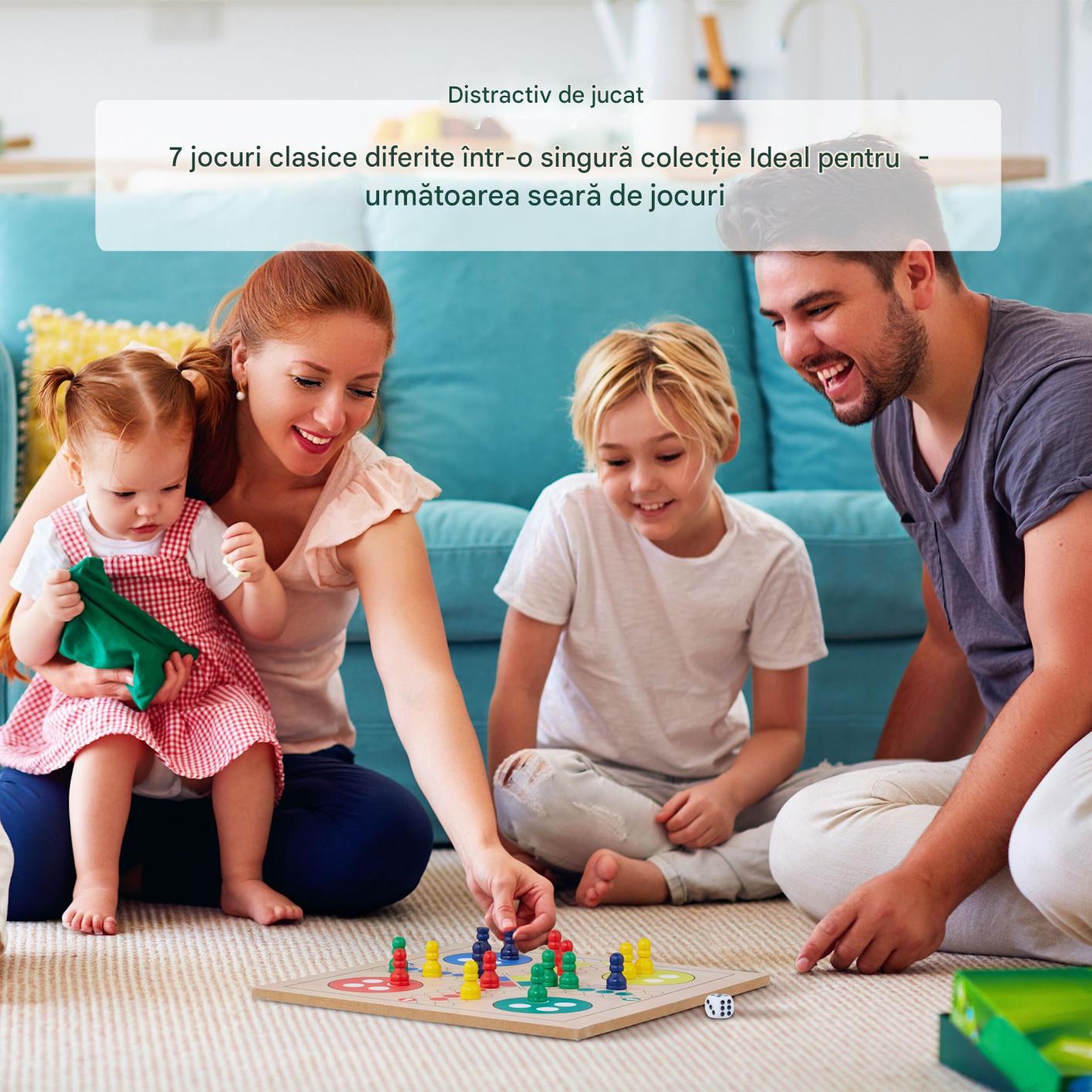 Colectie de jocuri din lemn 7-in-1, cu 7 jocuri clasice, set compact cu sah, dame, ludo, backgammon, tic tac toe, jocul scarilor si steaua chinezeasca