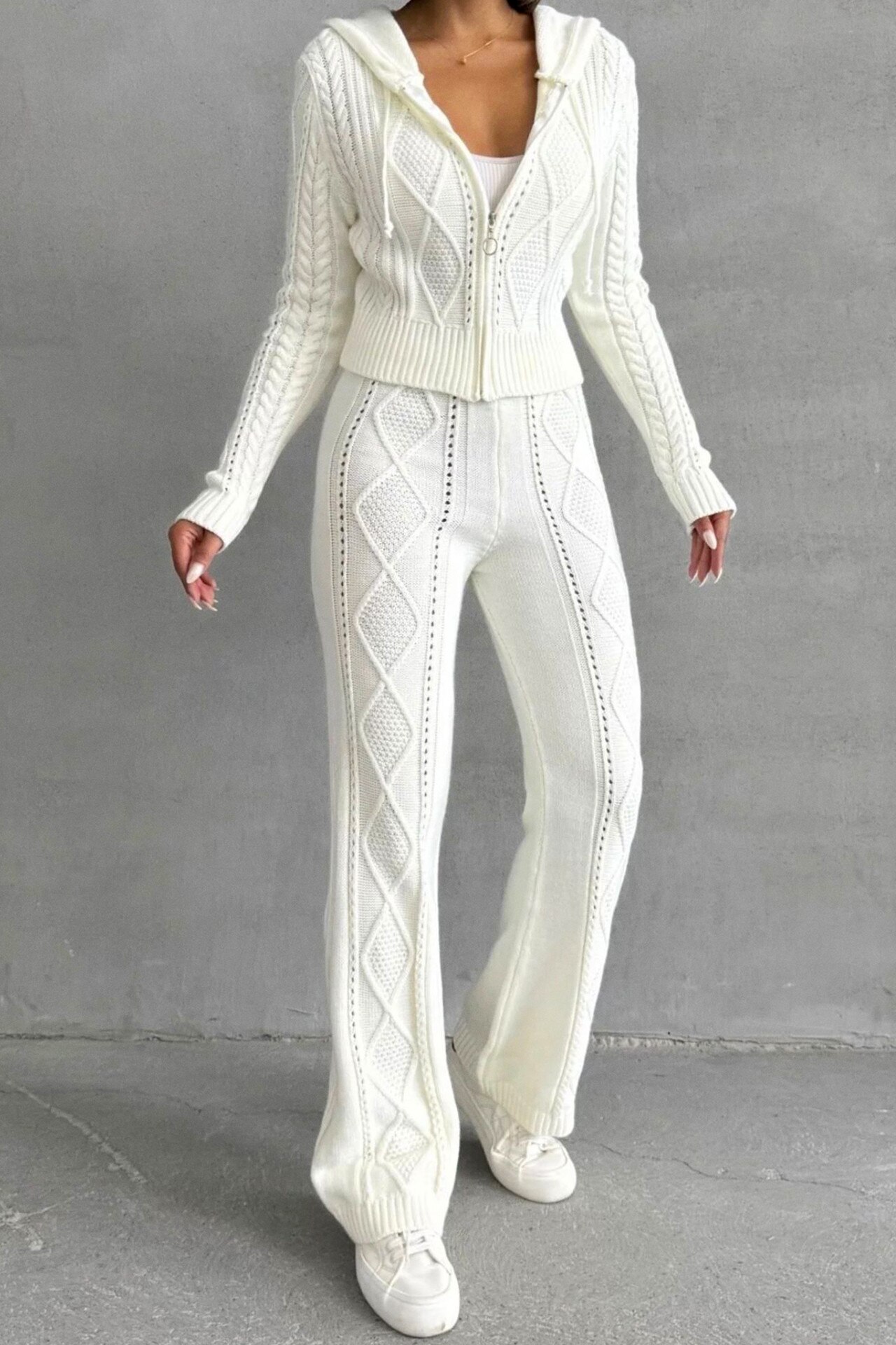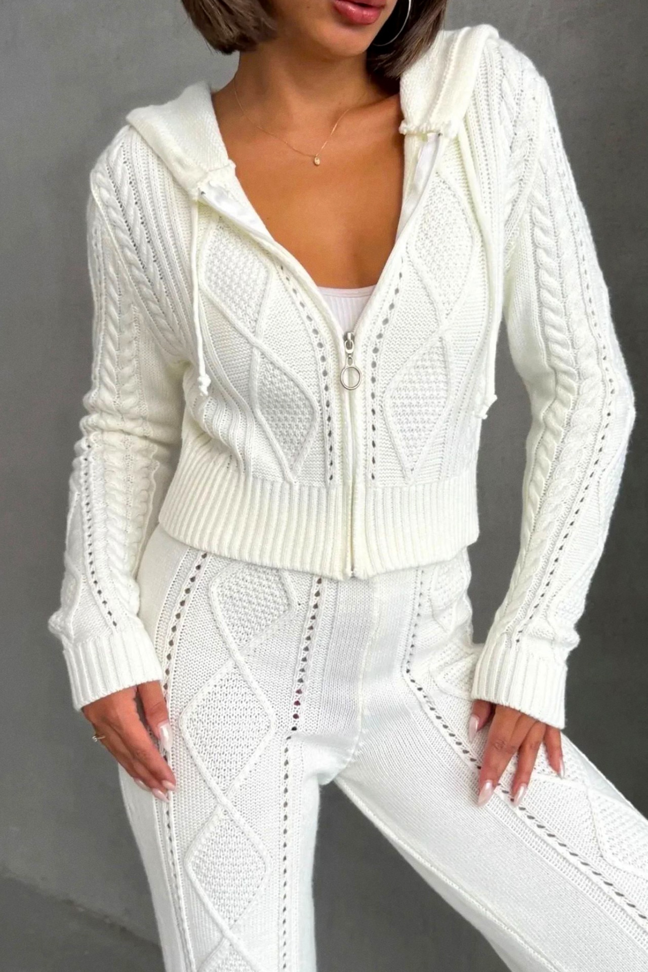 Compleu casual din tricot TOREN, bluza scurta cu fermoar si pantaloni, Alb, Marime universala S/M, FashionForYou