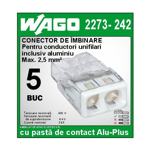 Conector de imbinare pentru conductori unifilari, inclusiv aluminiu WAGO 2273 242 Max. 2, 5 mm² cu pasta de contact Alu-Plus 5 BUC