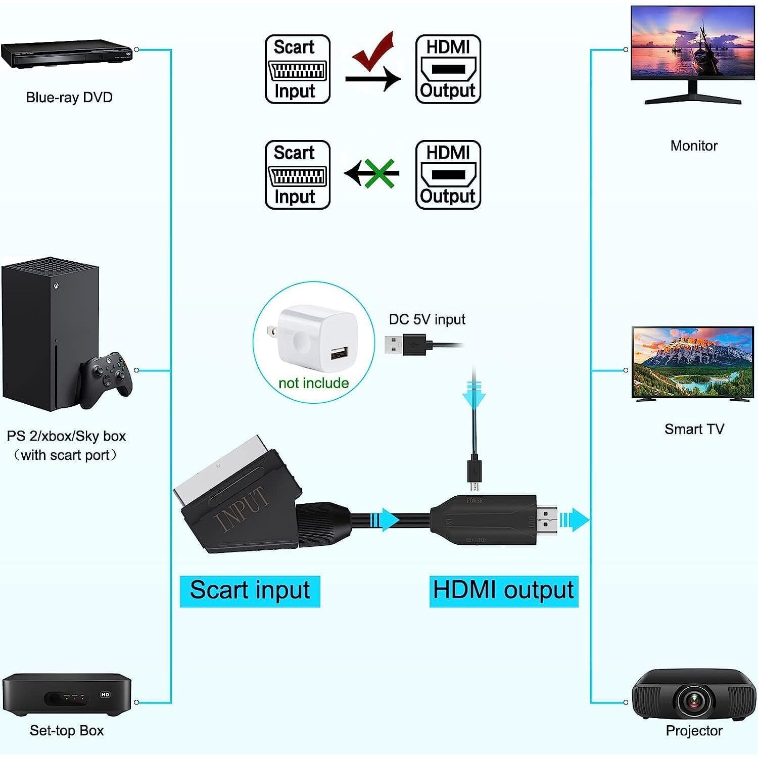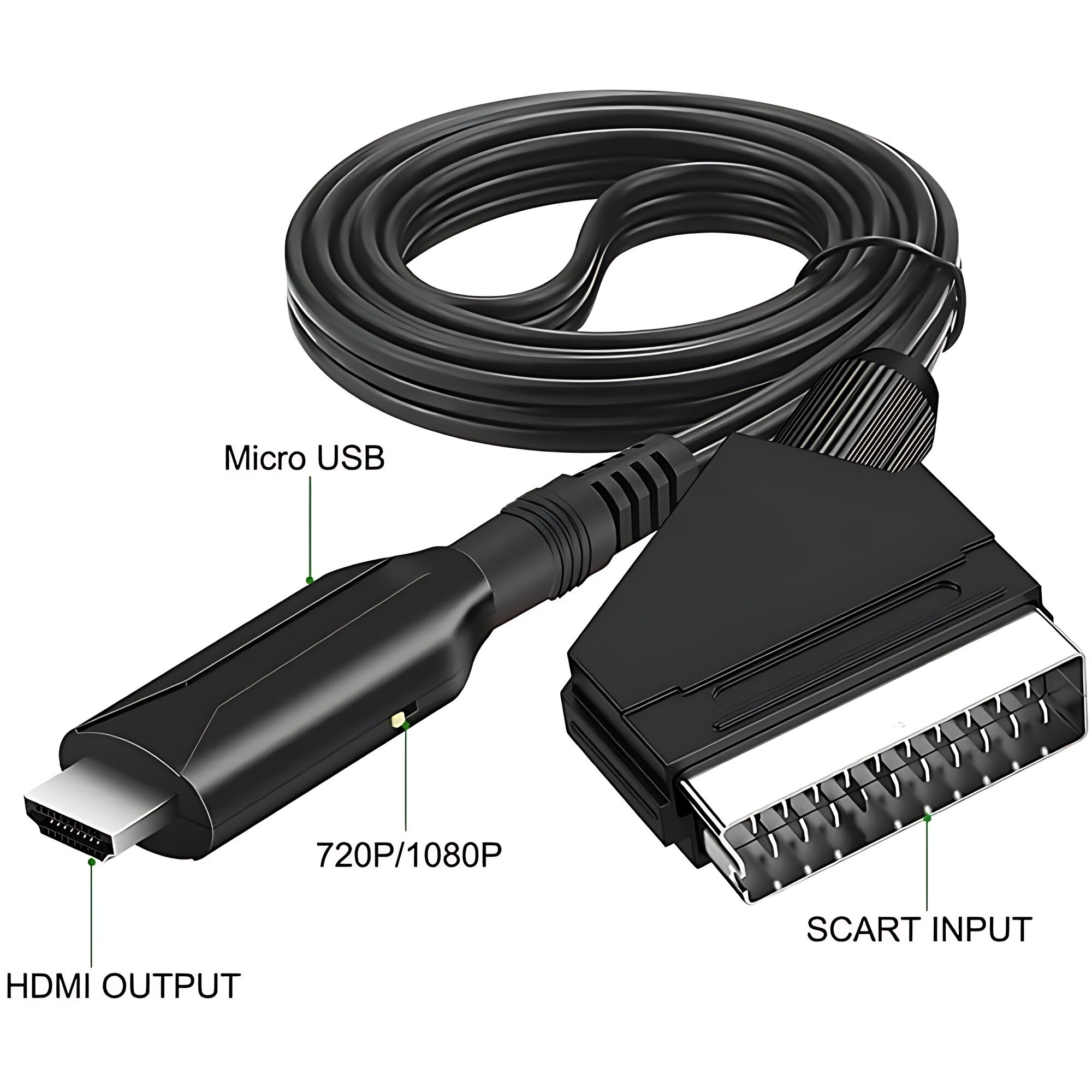 Convertor SCART la HDMI, Dussdote, 720P/1080p, alimentare USB, usor de transportat si utilizat, pentru HDTV/DVD/PS3, 1m, negru