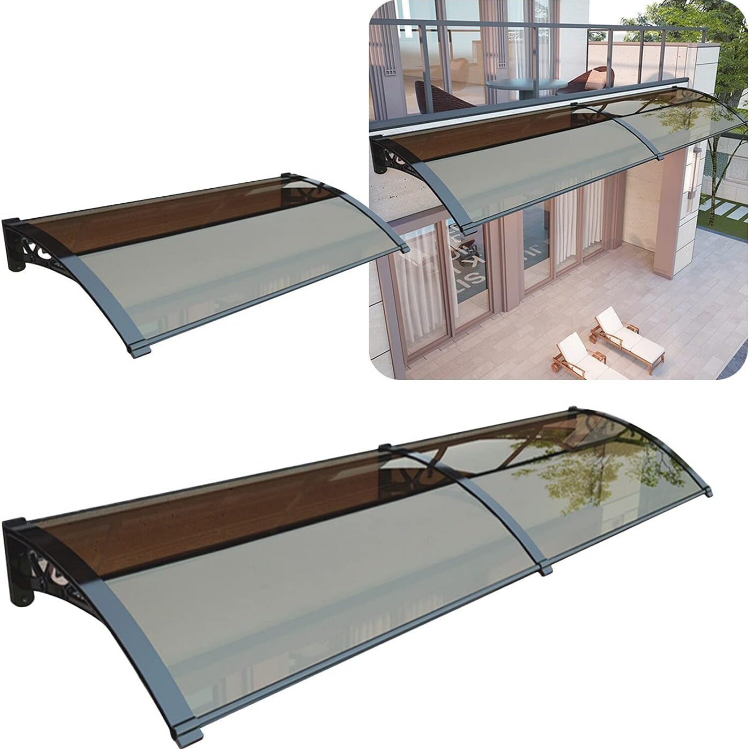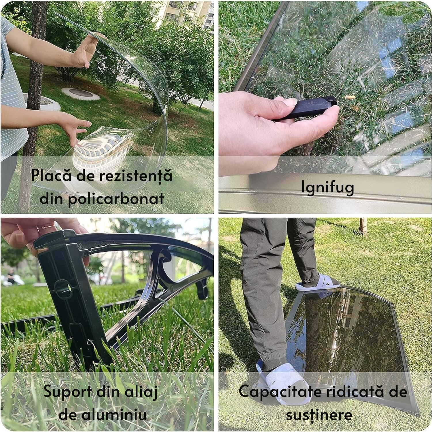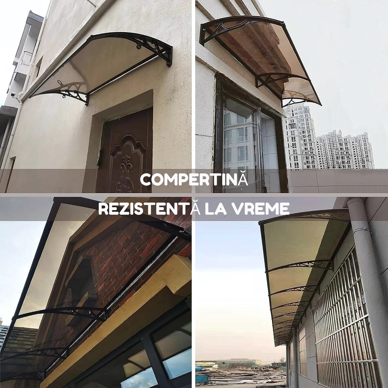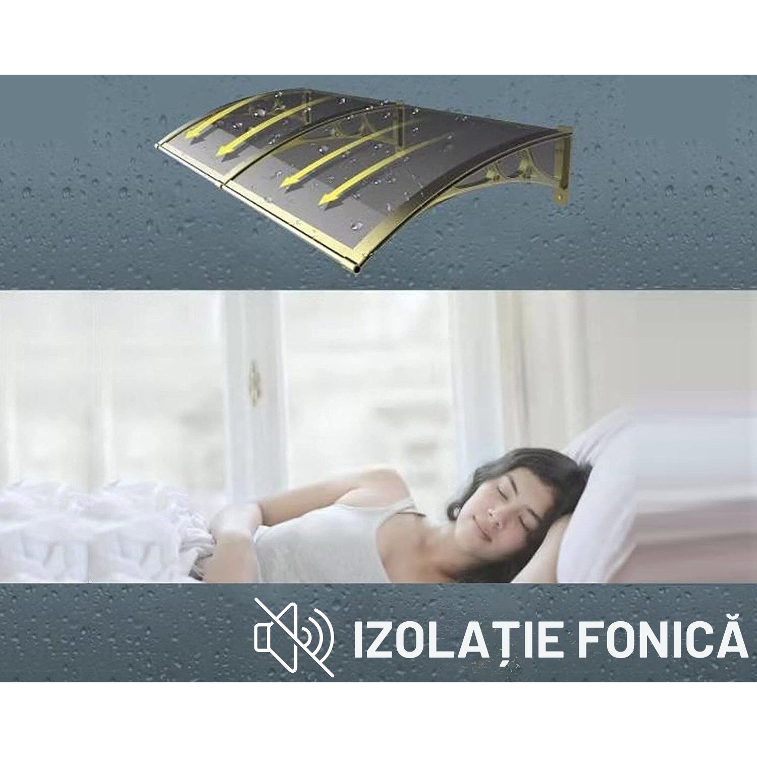 Copertina practica si rezistenta pentru usa sau fereastra JOZY®, cu design simplu si eficient, dimensiuni 240 x 100 cm, ideala pentru zone expuse la ploaie, construita din policarbonat si aluminiu, protejeaza fara sa blocheze lumina