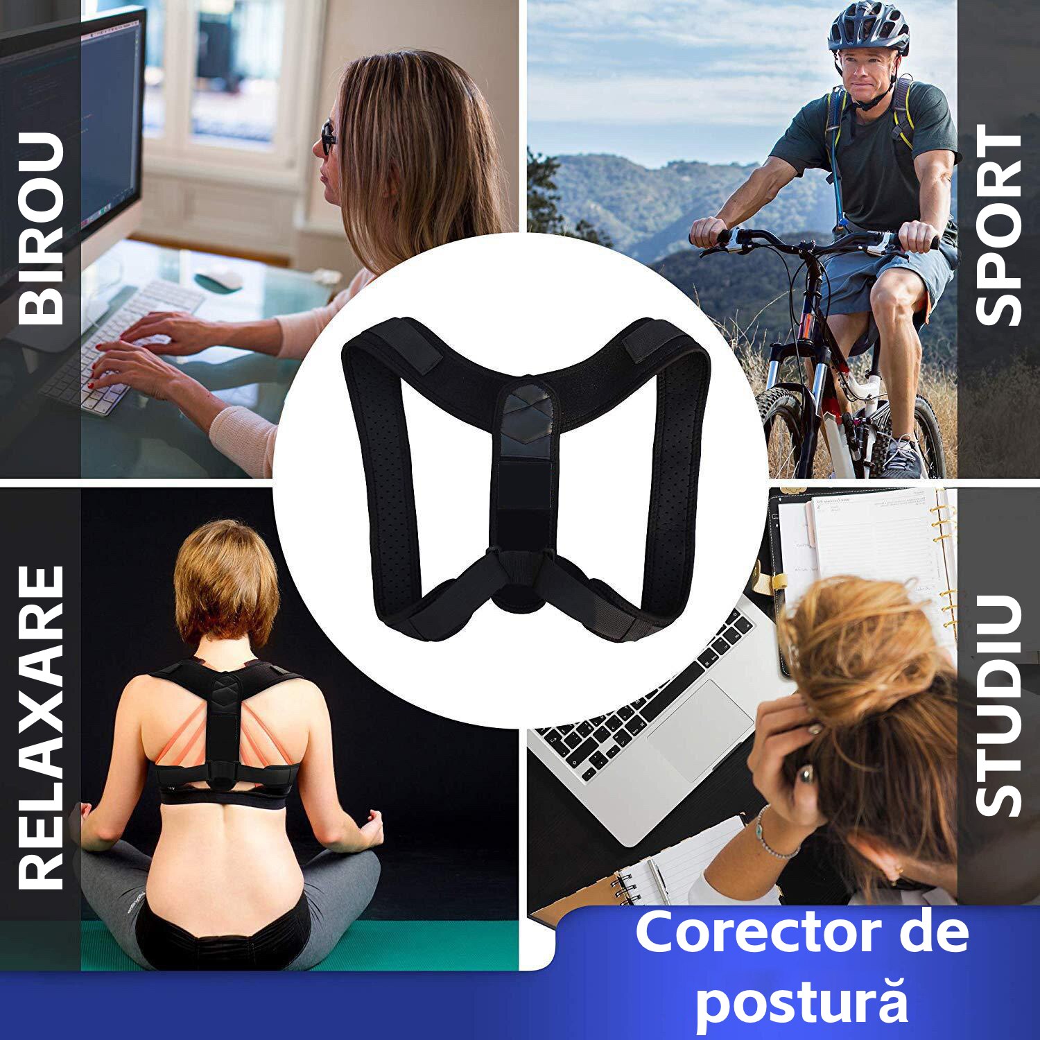 Corector de postura, indreptator pentru spate, sustine umerii, gatul si clavicula, suport pentru spate, trainer unisex pentru postura, dimensiune reglabila, negru