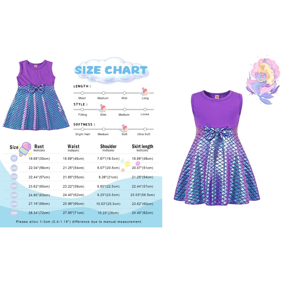 Design: rochie de vara viu colorata fara maneci, rochie bustiera imprimata cu solzi de peste stralucitori in stil teaca, impodobita cu o funda draguta in talie, piesele stralucitoare cu solzi de peste arata stralucitor de-a lungul micii sirene in lumina soarelui, te face sa stralucesti mai mult in multime, set de sirena dragut dintr-o singura bucata, spate si fusta elastica, se potriveste majoritatii tipurilor de corp, confortabil de purtat, purtati-o pe fetita dvs. se va simti ca o adevarata printesa. Potrivit: Aceasta rochie de printesa este perfecta pentru petreceri sau alte ocazii speciale, cum ar fi petreceri tematice, petreceri aniversare, Halloween, Craciun, carnavaluri, jocuri de rol etc. Este cadoul perfect pentru copilul dvs.