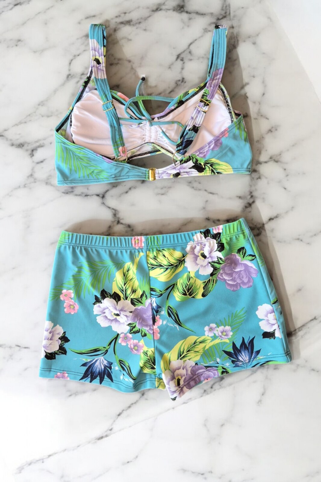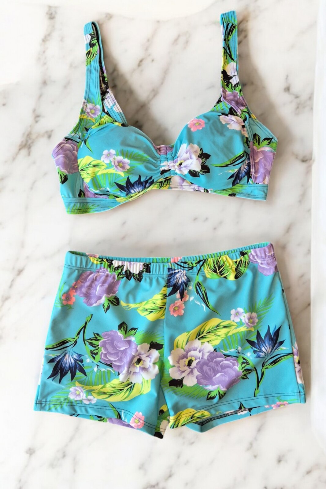embody - Costum de baie 2 piese, marime mare, slipi tip pantaloni scurti, sutien bustiera, ocean blue flowers, XL