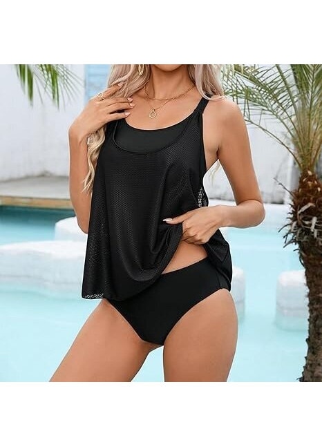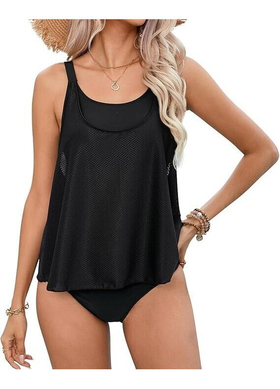 Costum de baie dama 2 piese, Tankini, cu maieu semi-transparent cu bustiera integrata si slip, Negru, S