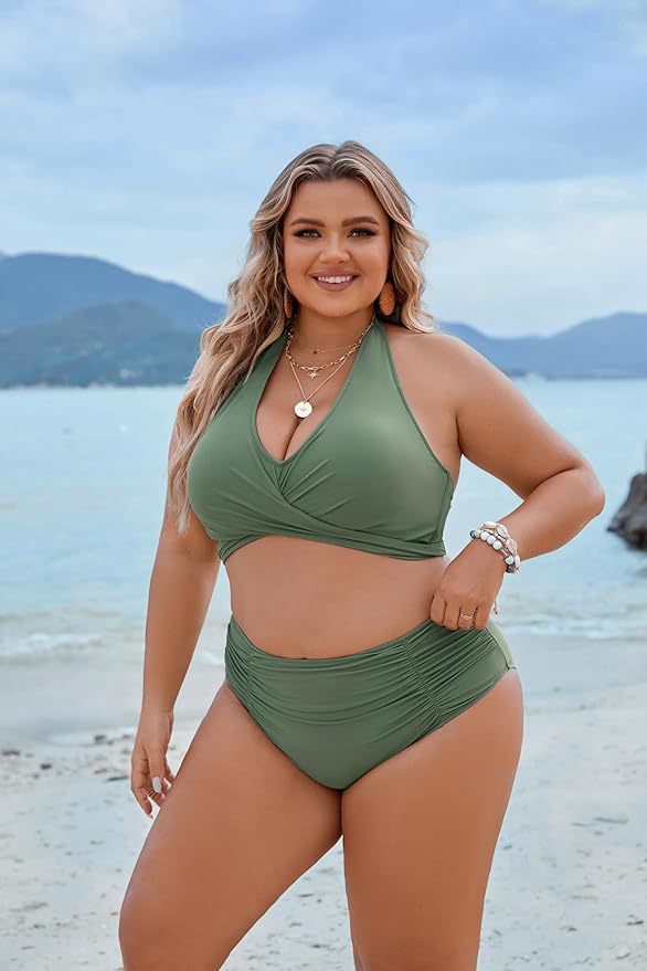 Costum de baie dama din 2 piese, Cootway, push-up, decolteu in forma V, cu talie inalta, modelator, design plisat incrucisat pe piept, Nailon, marimea M, Verde