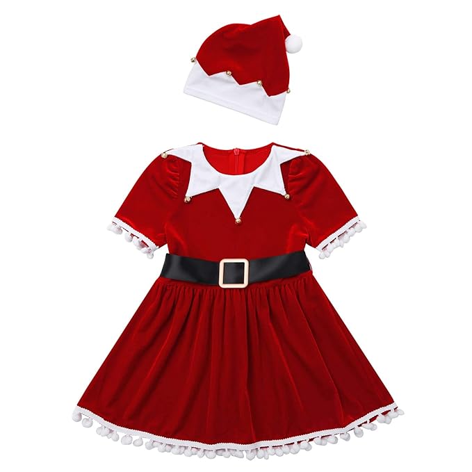Costum fete Craciunita cu ciucuri, centura, caciulita, 9-10 ani, rosu