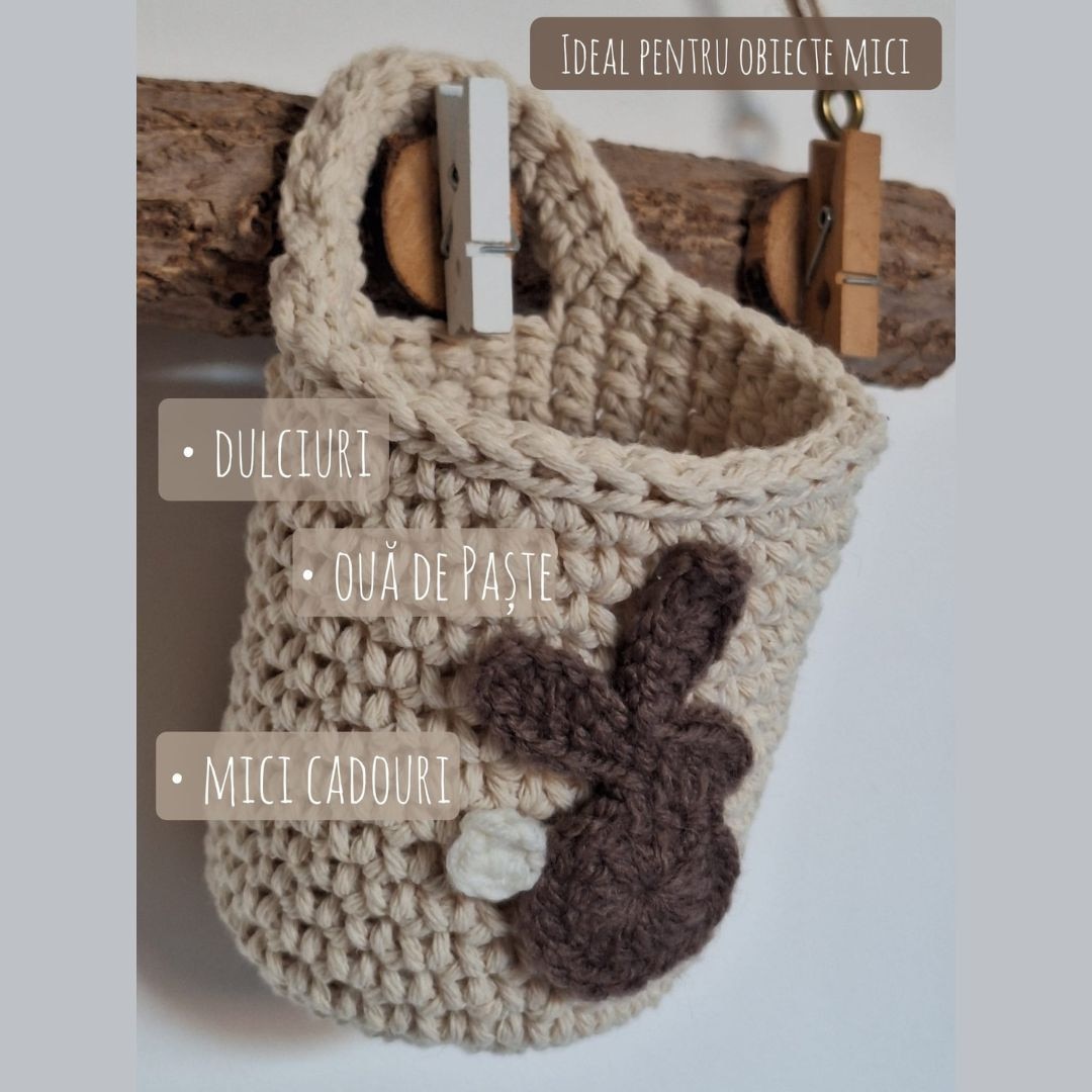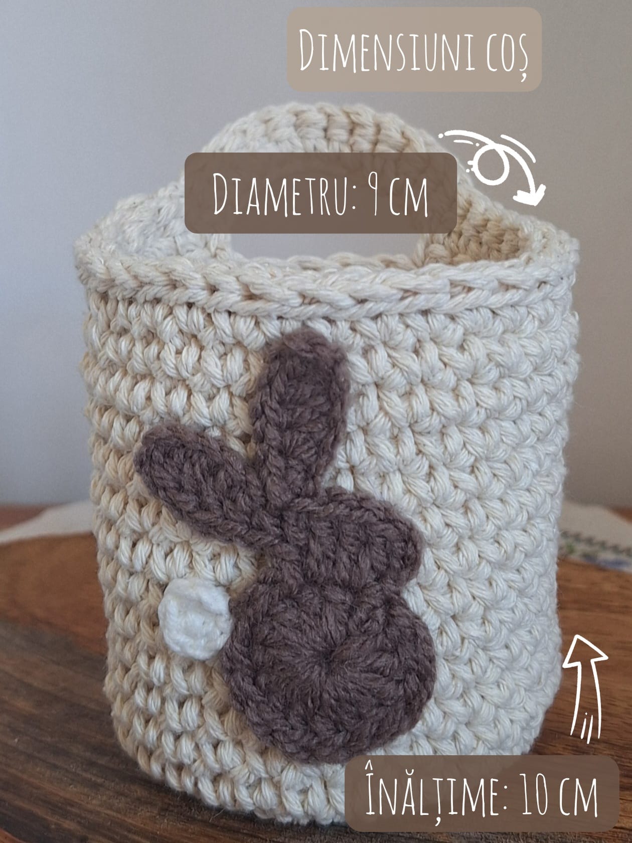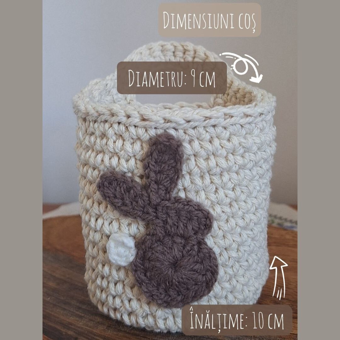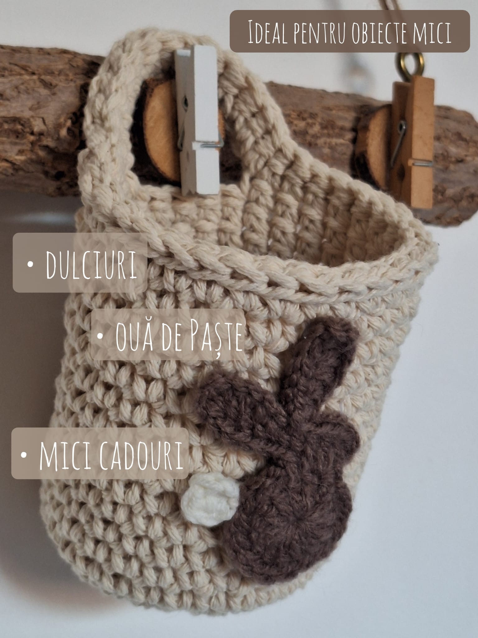 Cosulet Crosetat BABOLEXA® Fabricat de Mana, 9×10 cm, Decor cu Iepuras, Cos pentru Cadouri Mici, Dulciuri si Biletele, Ornament Rustic Decorativ, Handmade si Rezistent, din Material Natural din Bumbac, Bej/Maro