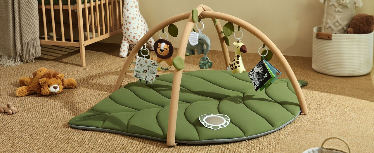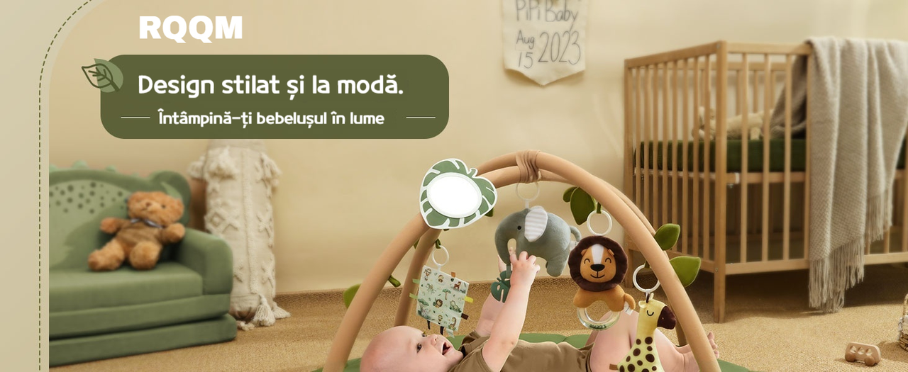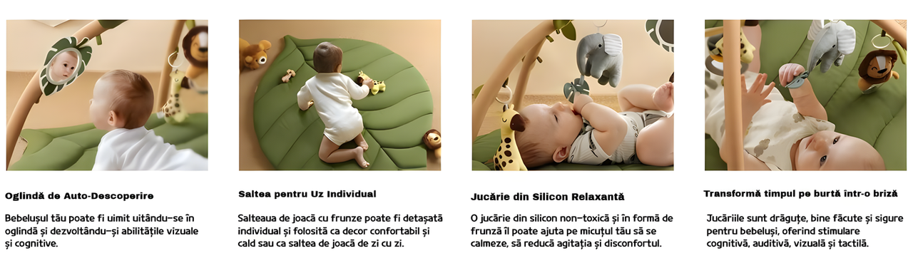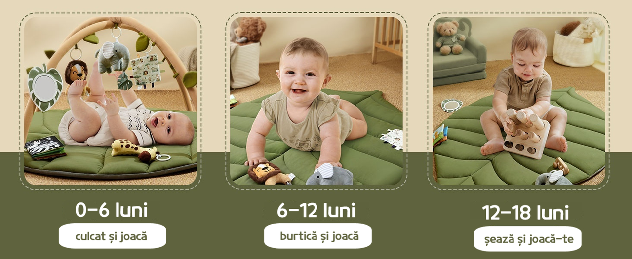 Design unic in curs de brevetare: Experimentati salteaua noastra exclusiva de activitati pentru bebelusi cu tematica safari, incantati-va micutul cu ore de distractie practica si invatare interactiva.