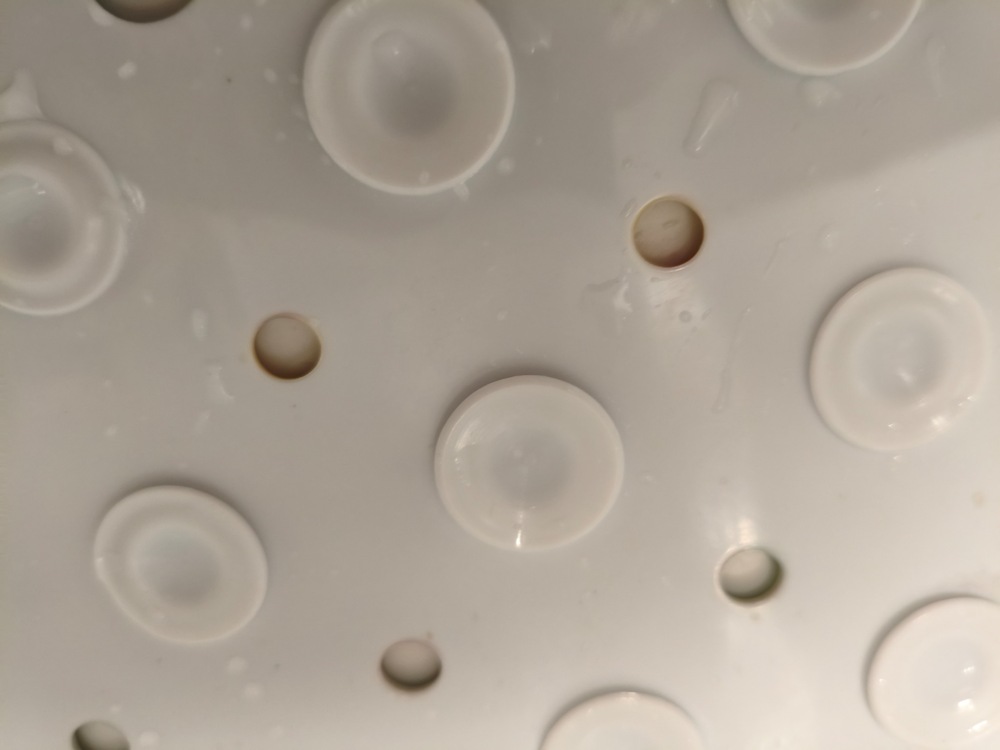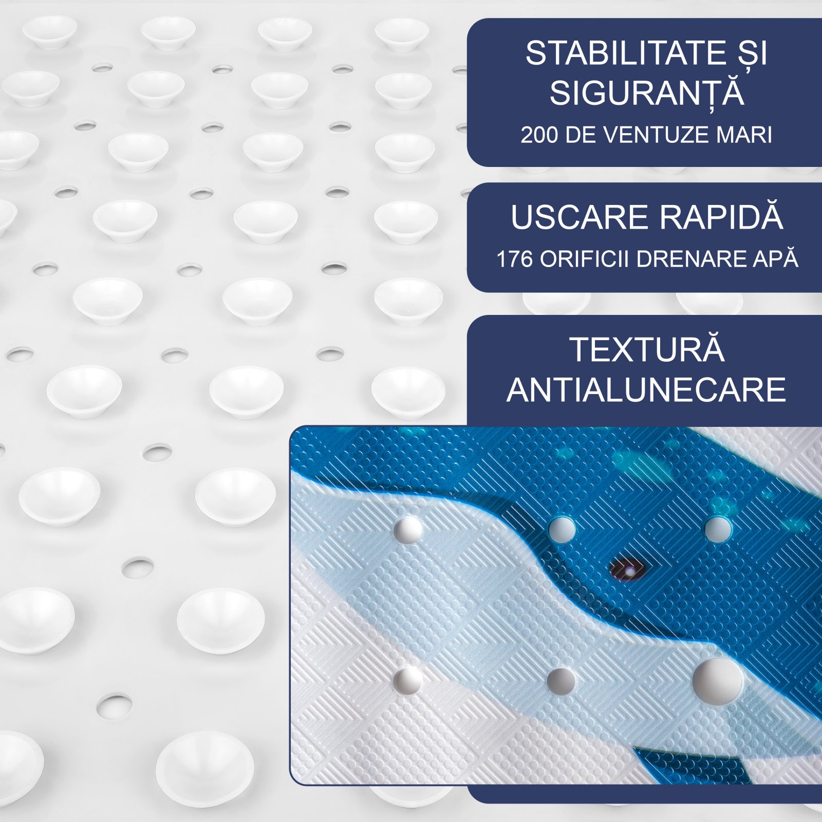 Asezati covorasul in cada umpluta cu putina apa si apoi apasati ventuzele pentru a le fixa! Trebuie sa apasati ferm, sa se formeze vid, pentru ca ventuzele sa se fixeze bine. Apoi lasati apa in vana''.