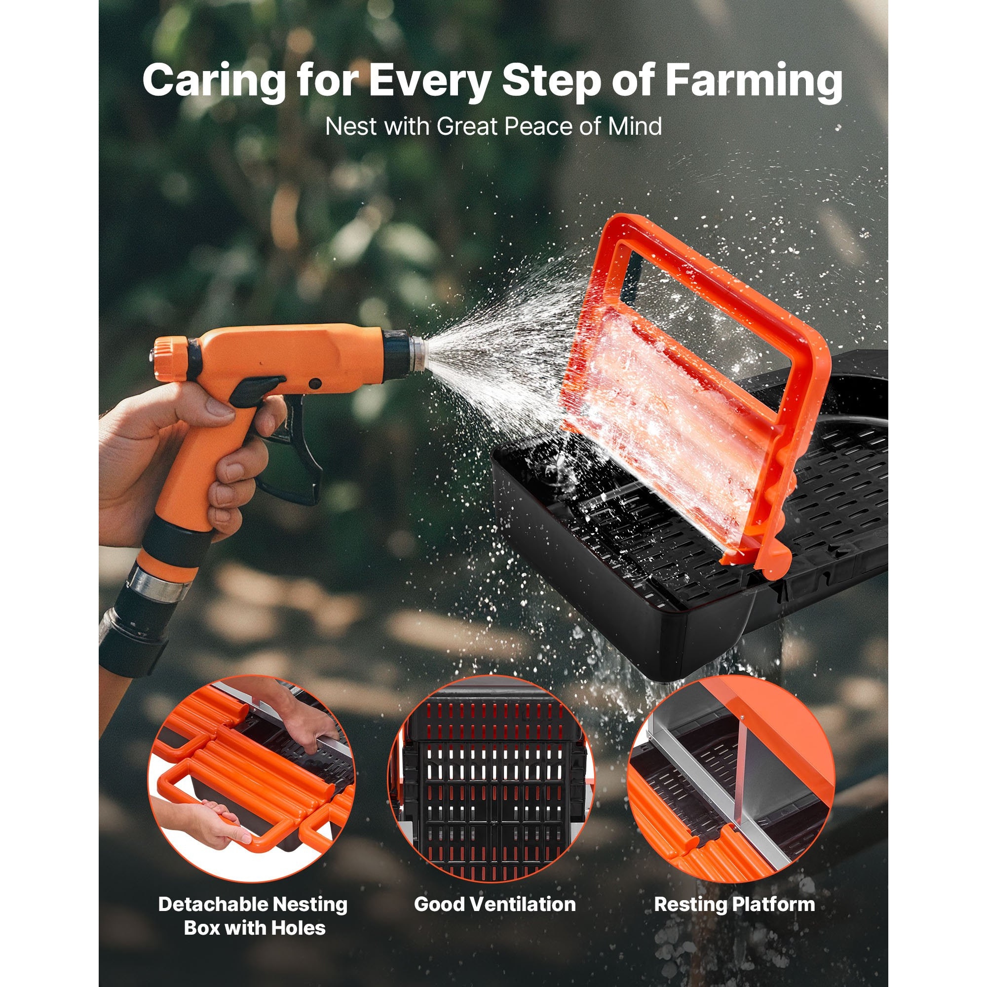 Tava de colectare se demonteaza rapid pentru curatare, iar platforma de odihna ajuta intrarea gainilor. Intretinerea zilnica devine mai rapida si mai igienica.