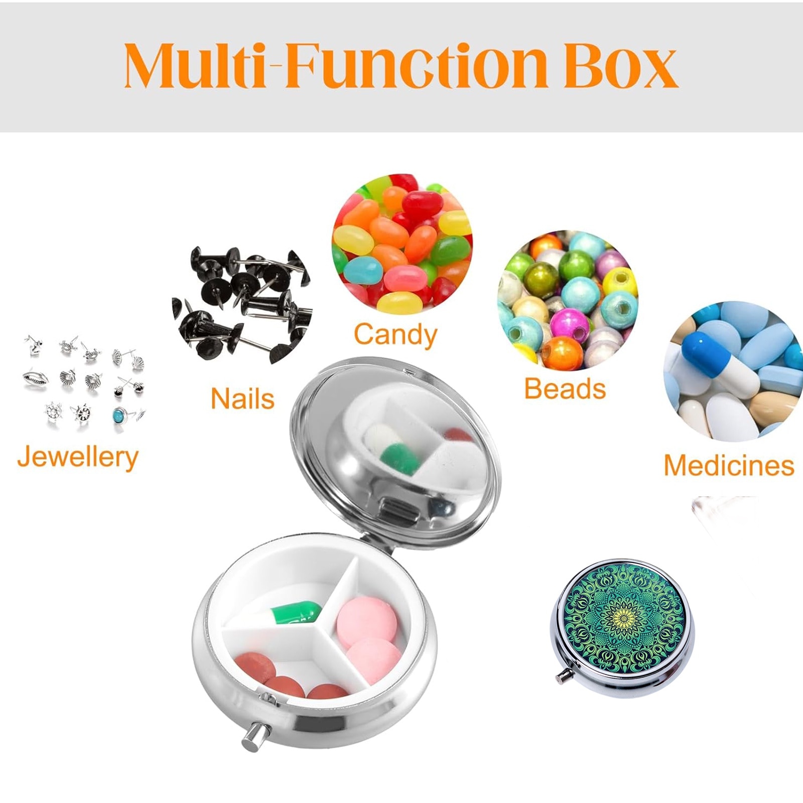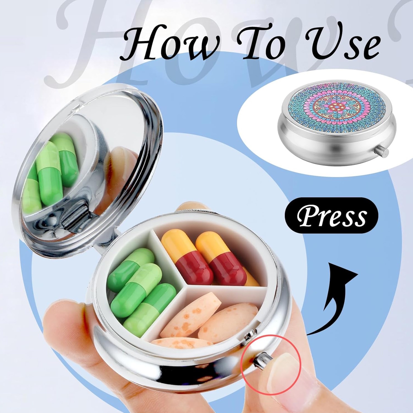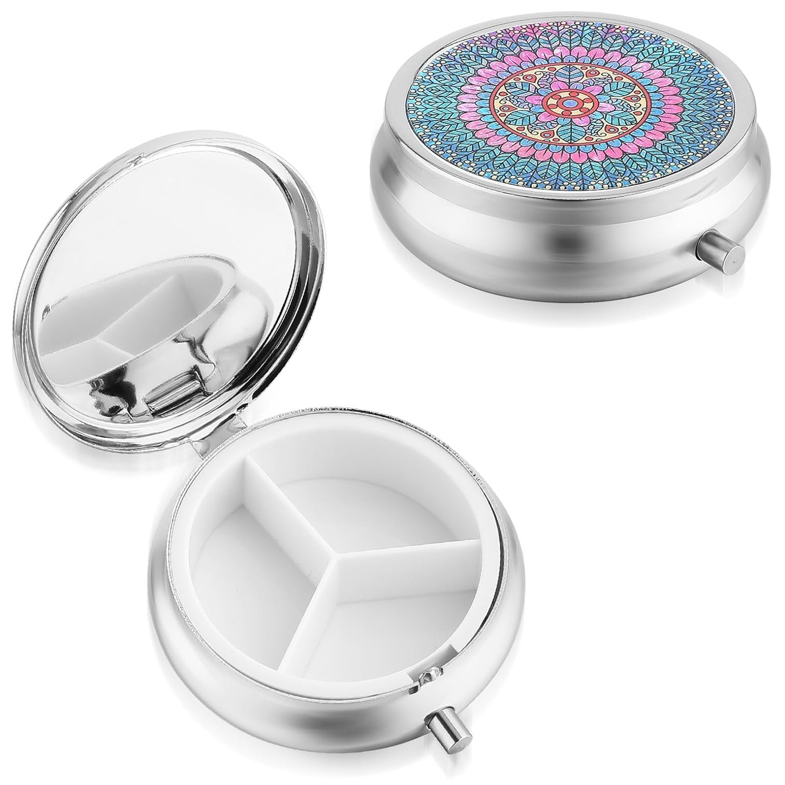 Cutie pentru medicamente, Axroad Mall, 3 compartimente, retro, cu oglinda, rotunda, Portabil, Design de model artistic, Robusta si durabila, pentru pastrarea pastilelor/vitaminelor/alte medicamente de urgenta, Metal/Plastic, 5x1.7cm, Multicolor