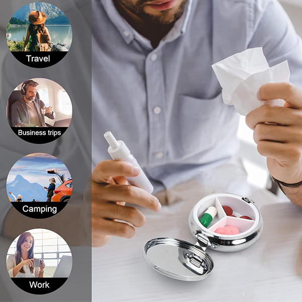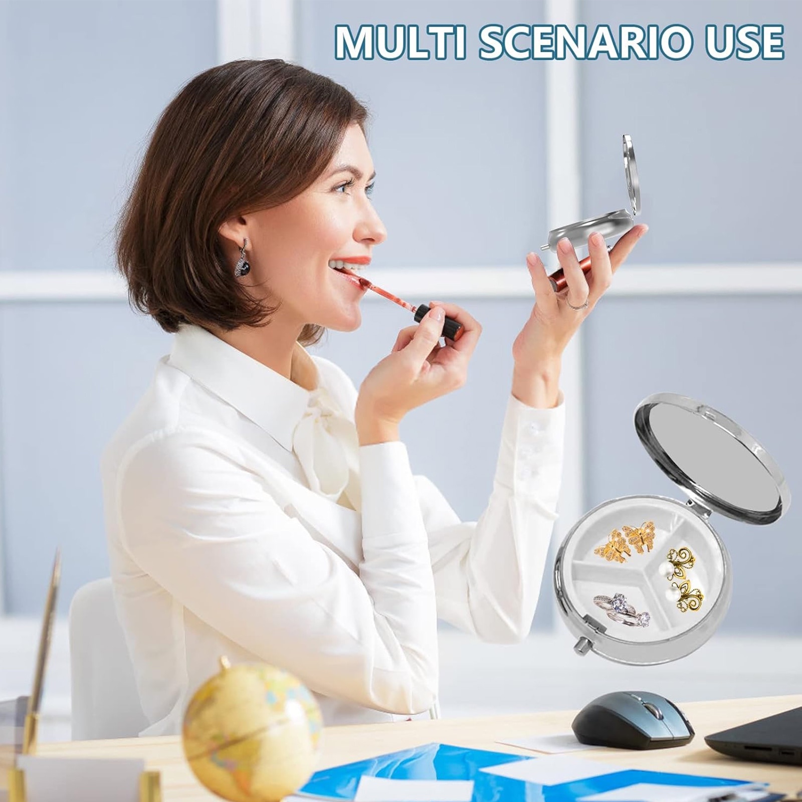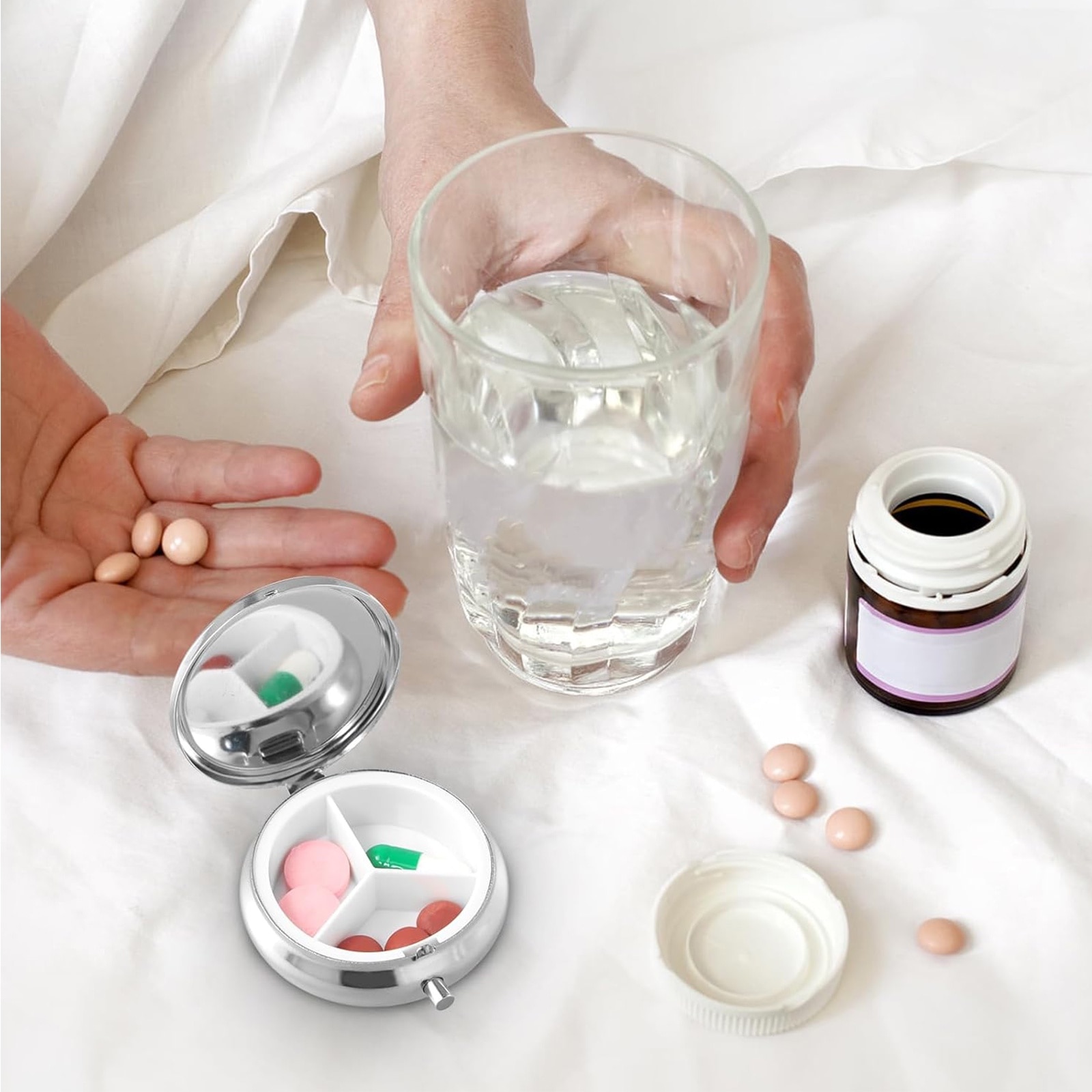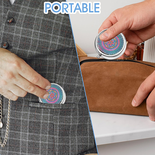 Cutie pentru medicamente, Axroad Mall, 3 compartimente, retro, cu oglinda, rotunda, Portabil, Design de model artistic, Robusta si durabila, pentru pastrarea pastilelor/vitaminelor/alte medicamente de urgenta, Metal/Plastic, 5x1.7cm, Multicolor