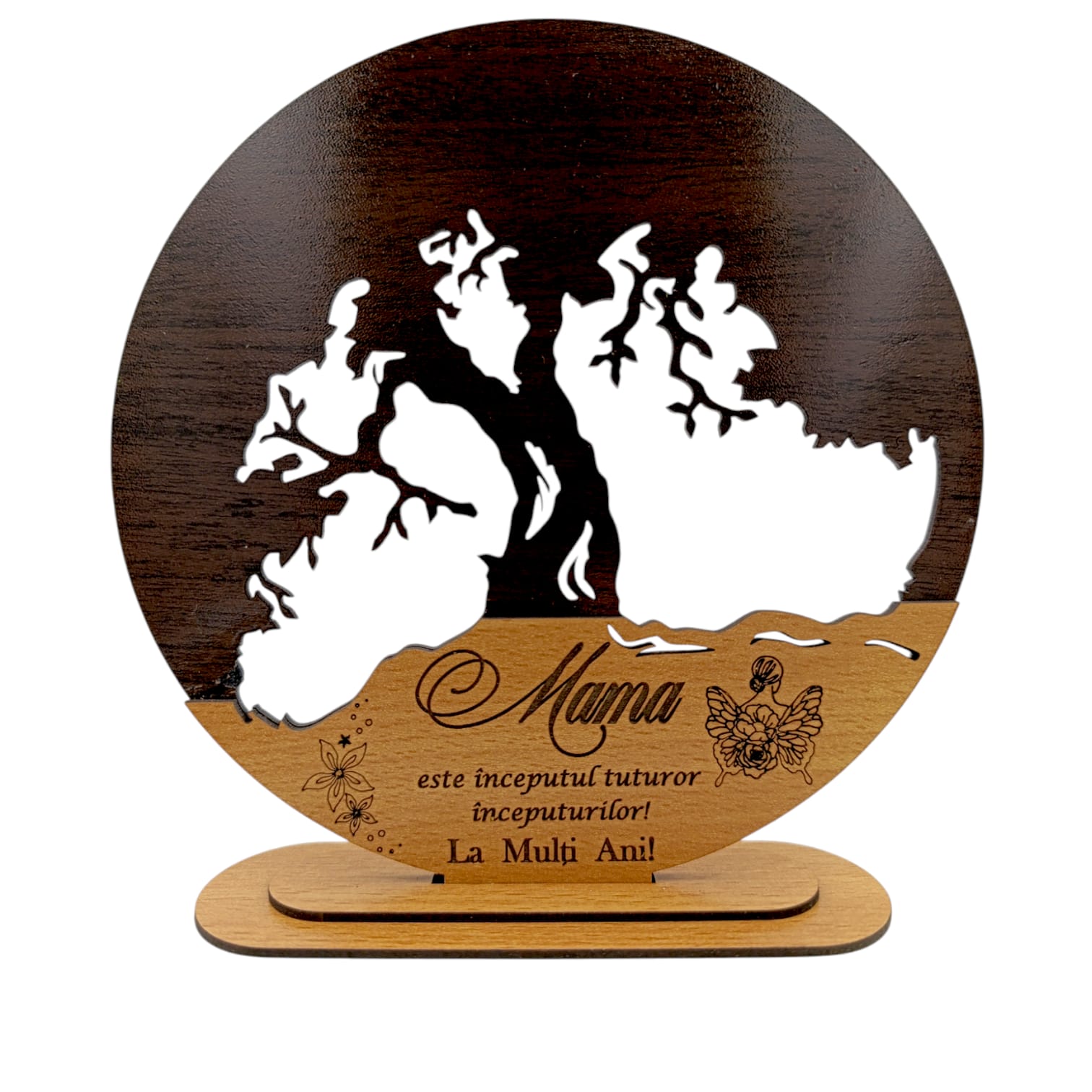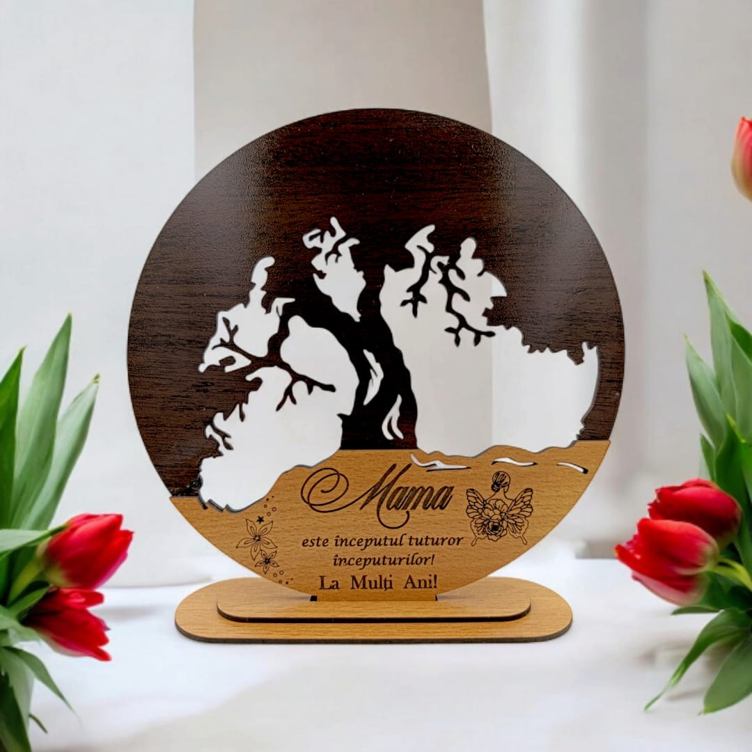 Decoratiune blank inima copacul vietii, personalizat pentru "Mama este inceputul...", baza cu suport din lemn, maro, 25cm