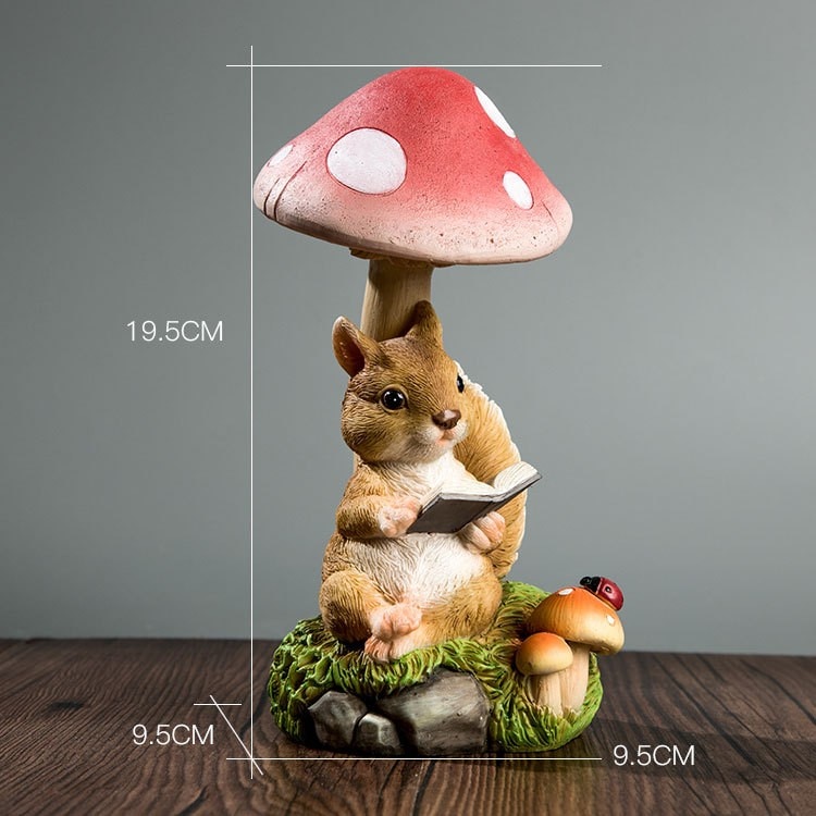 Decoratiune pentru Gradina, Flippy, Lumini LED cu Incarcare solara, 19.5 x 9.5 x 9.5 cm, Model Ciuperca cu Veverita care Citeste, Maro
