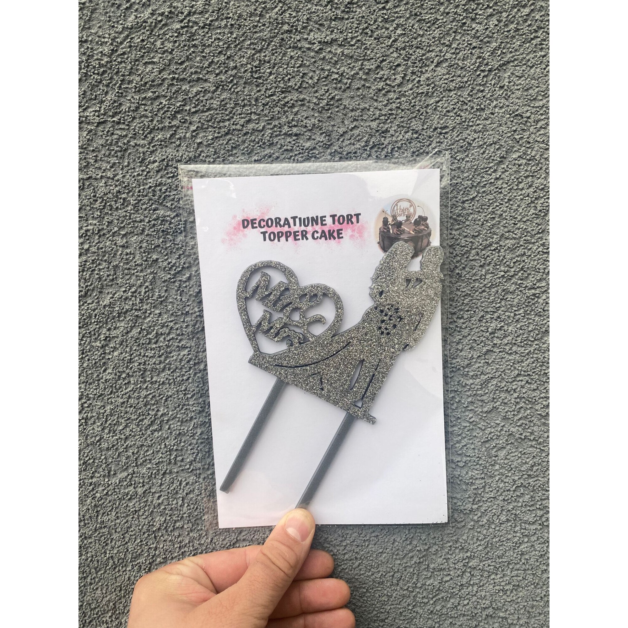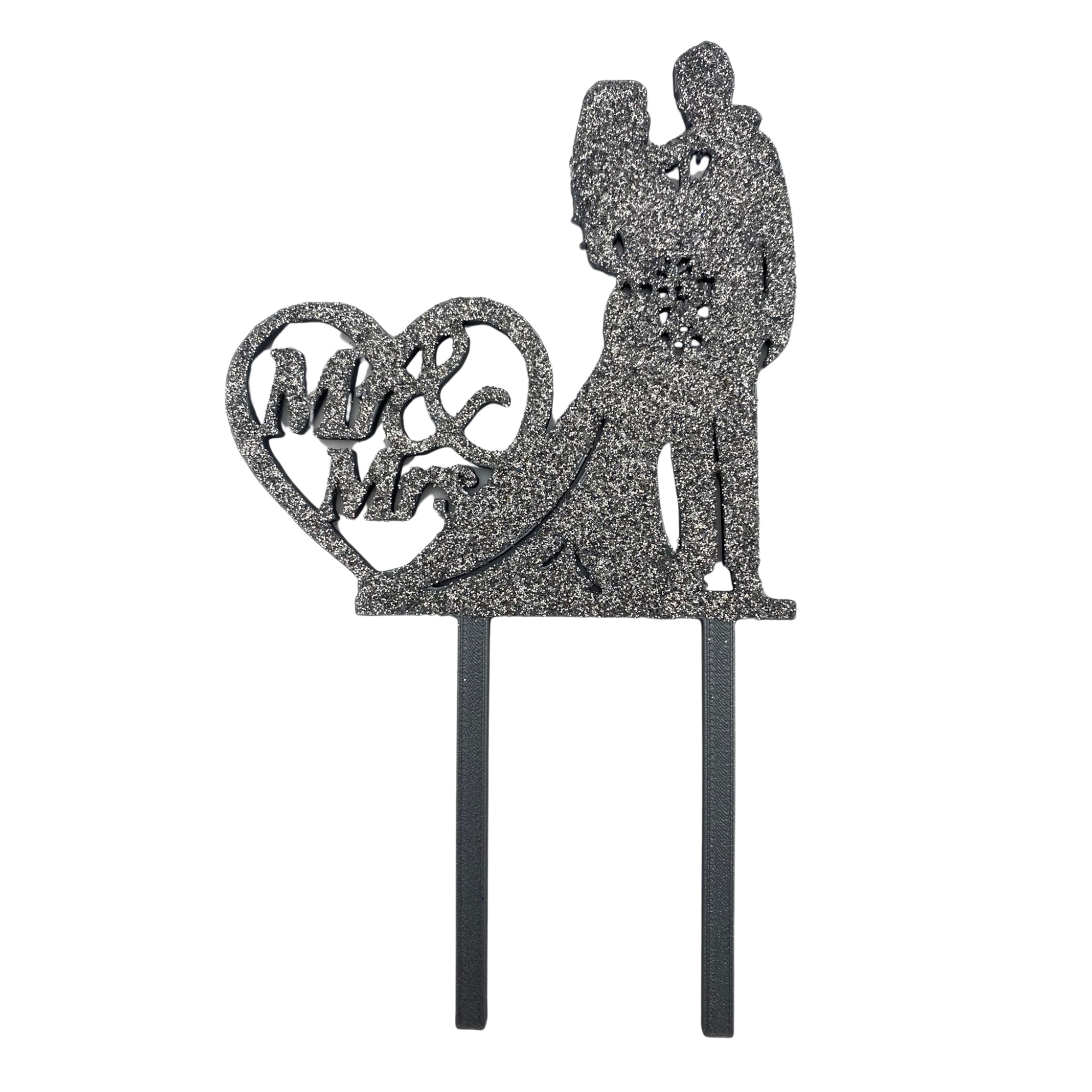 Decoratiune topper tort "Mr and Mrs, Mire si mireasa", indragostiti, tortul miresei 19 x 11 cm, argintiu cu sclipici