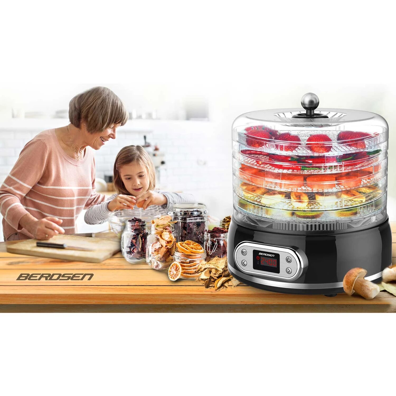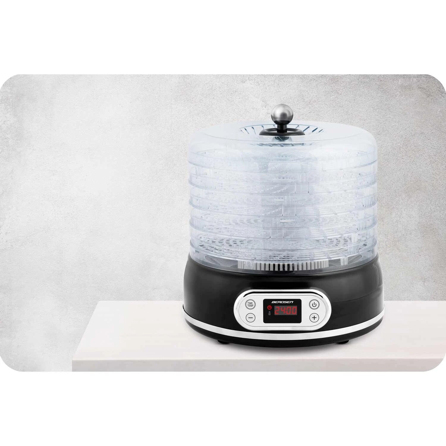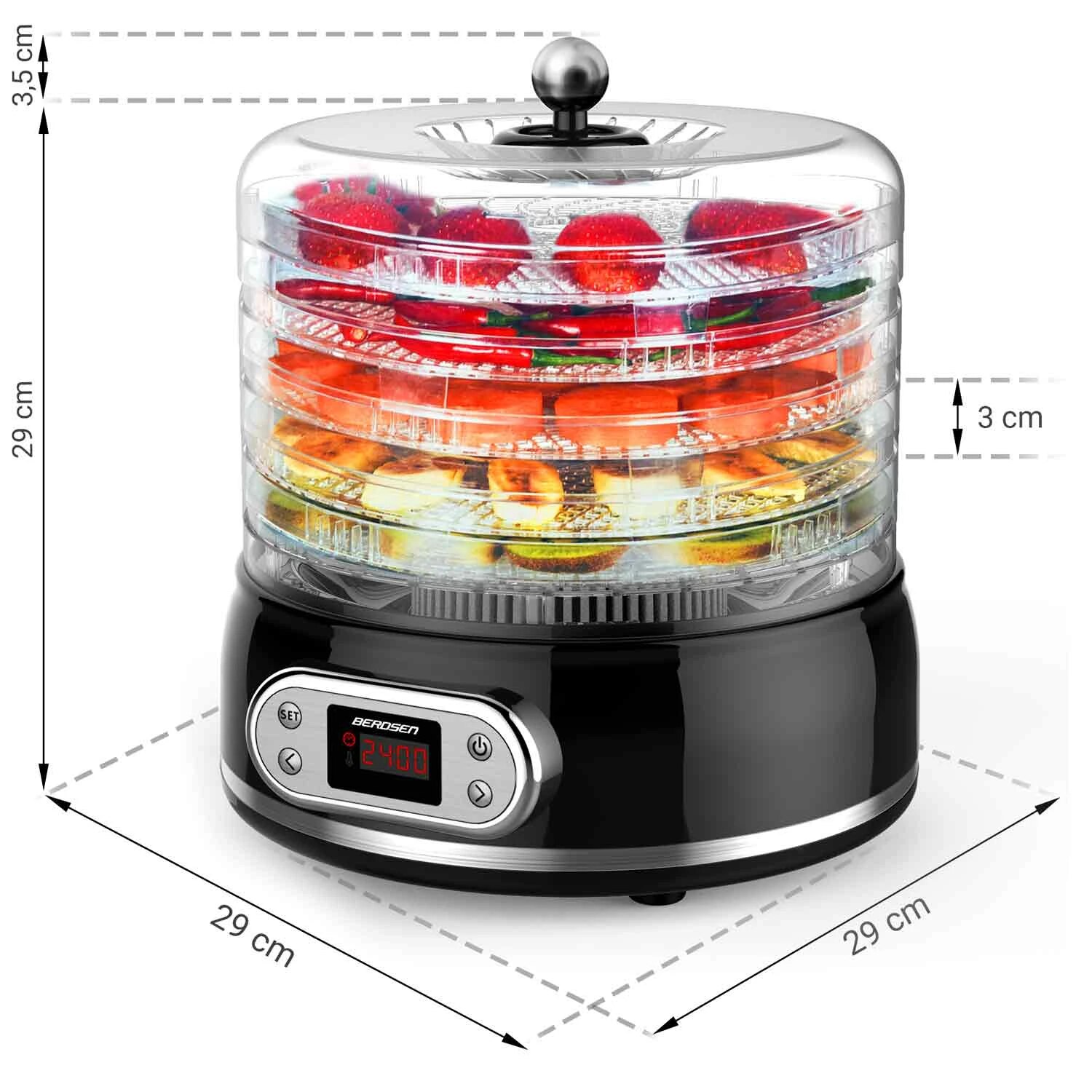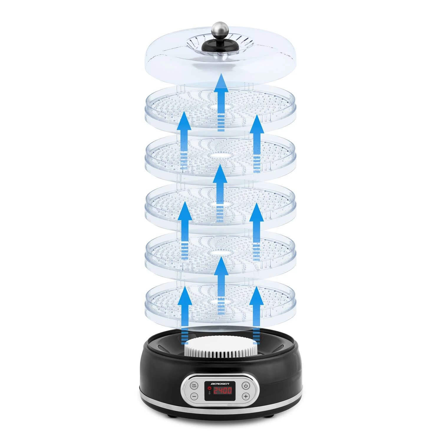 Deshidrator de alimente DacEnergy©, control temperatura 35-70°C, 400 W, 5 tavi cu diametru de 27 cm, protectie la supraincalzire, capacitate 10l