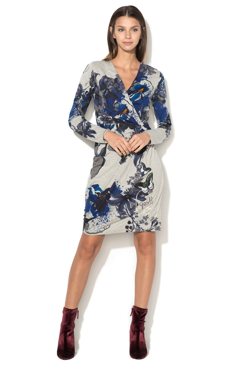 DESIGUAL - Rochie cu maneci lungi, imprimeu si detaliu petrecut, Gri melange, S