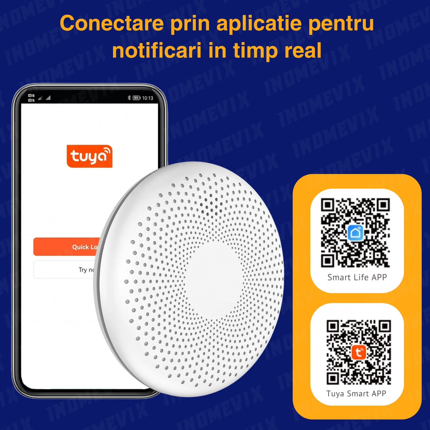 Detectorul wireless permite conectare prin aplicatiile Tuya Smart si Smart Life pentru notificari in caz de pericol in timp real