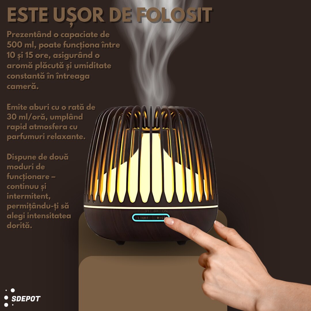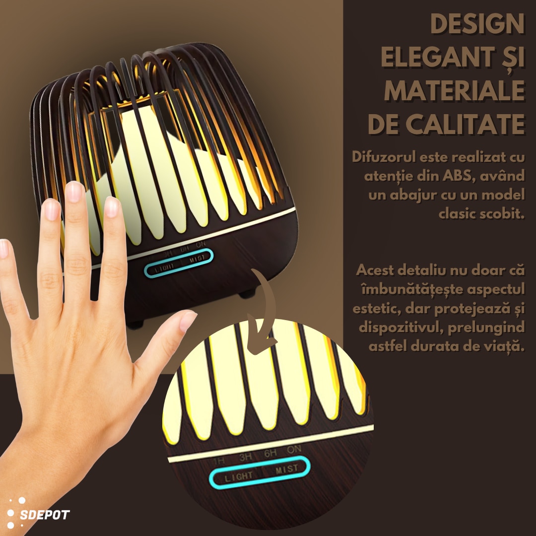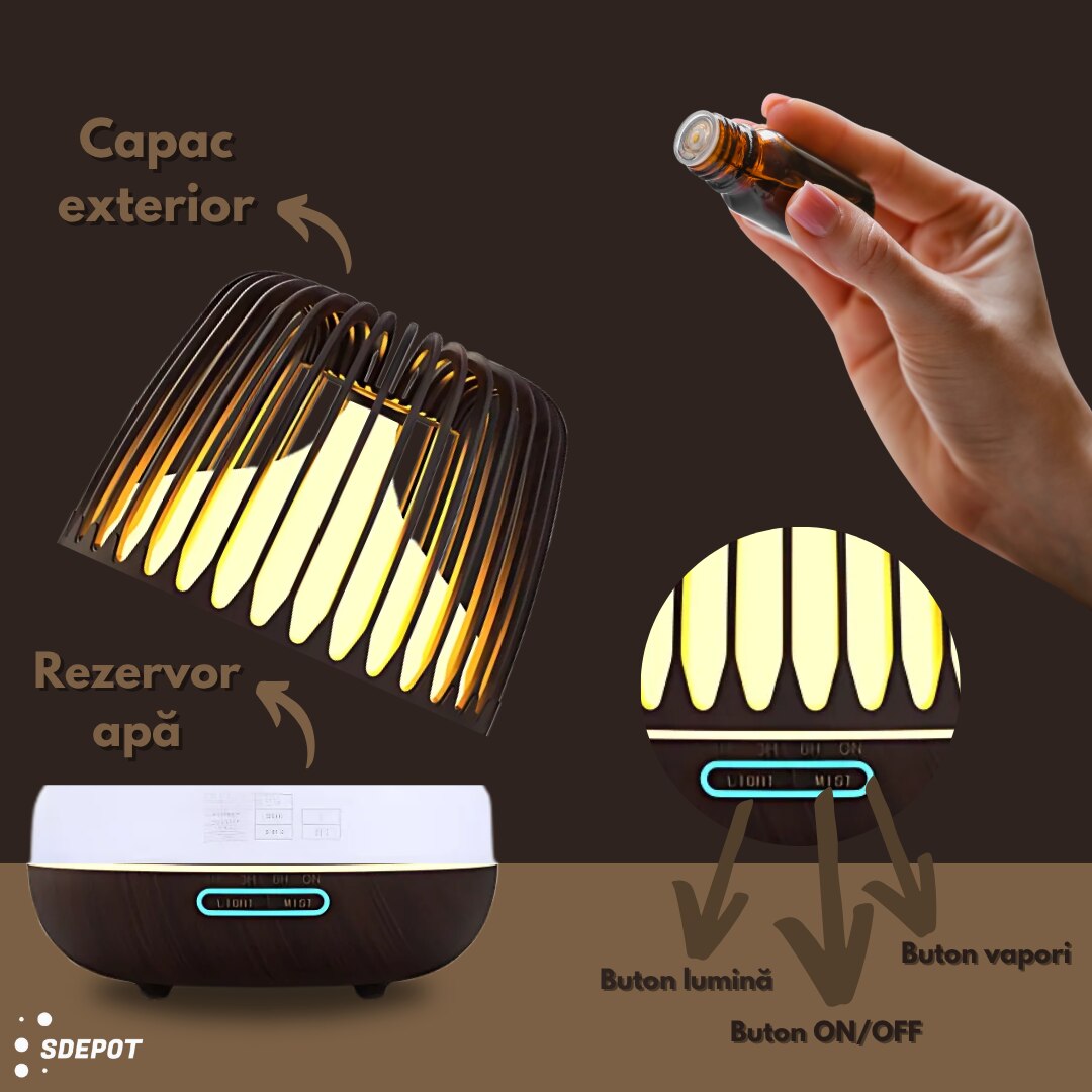 Difuzor pentru aromaterapie SDEPOT®, umidificator, cu lumina LED 7 culori, capacitate 500 ml, maro