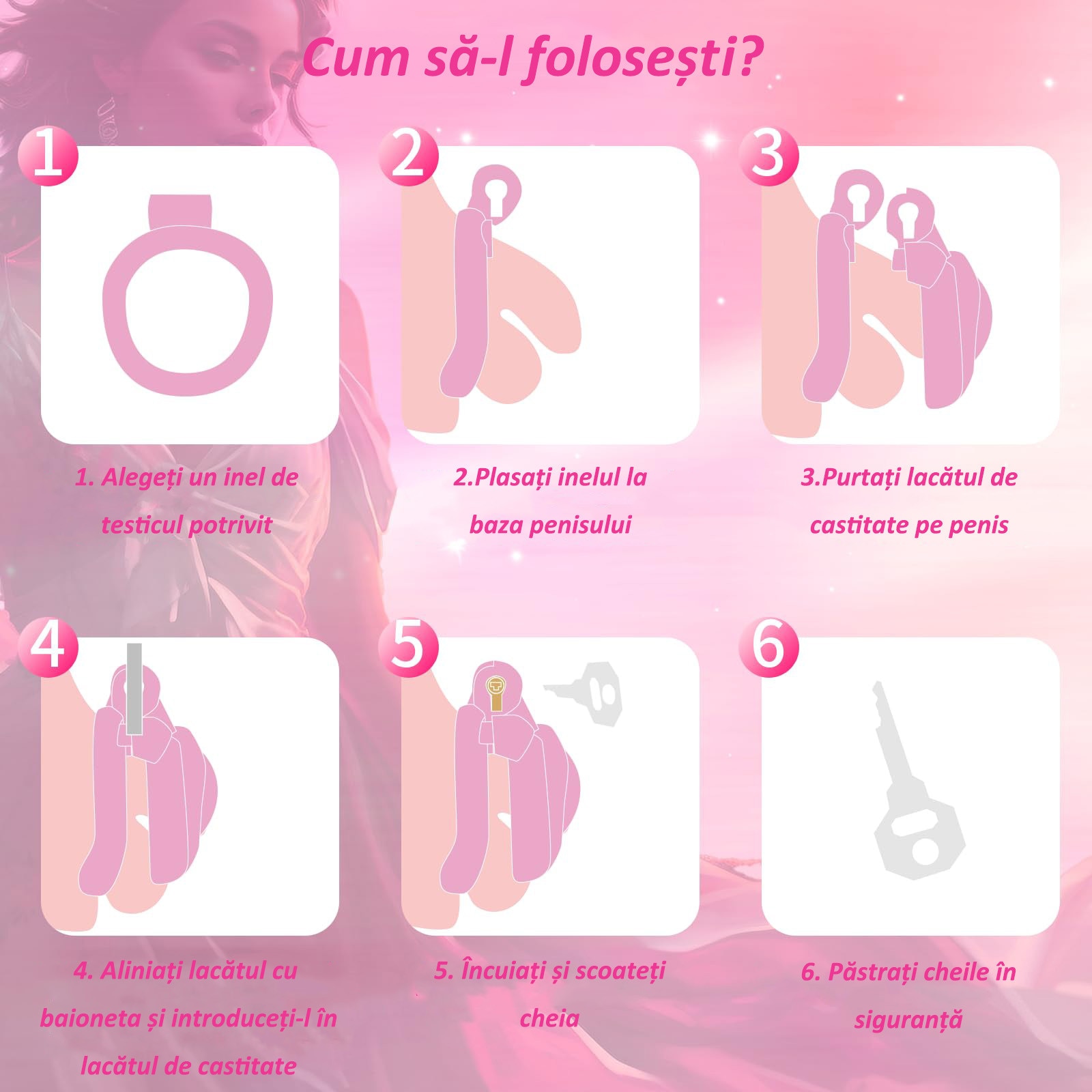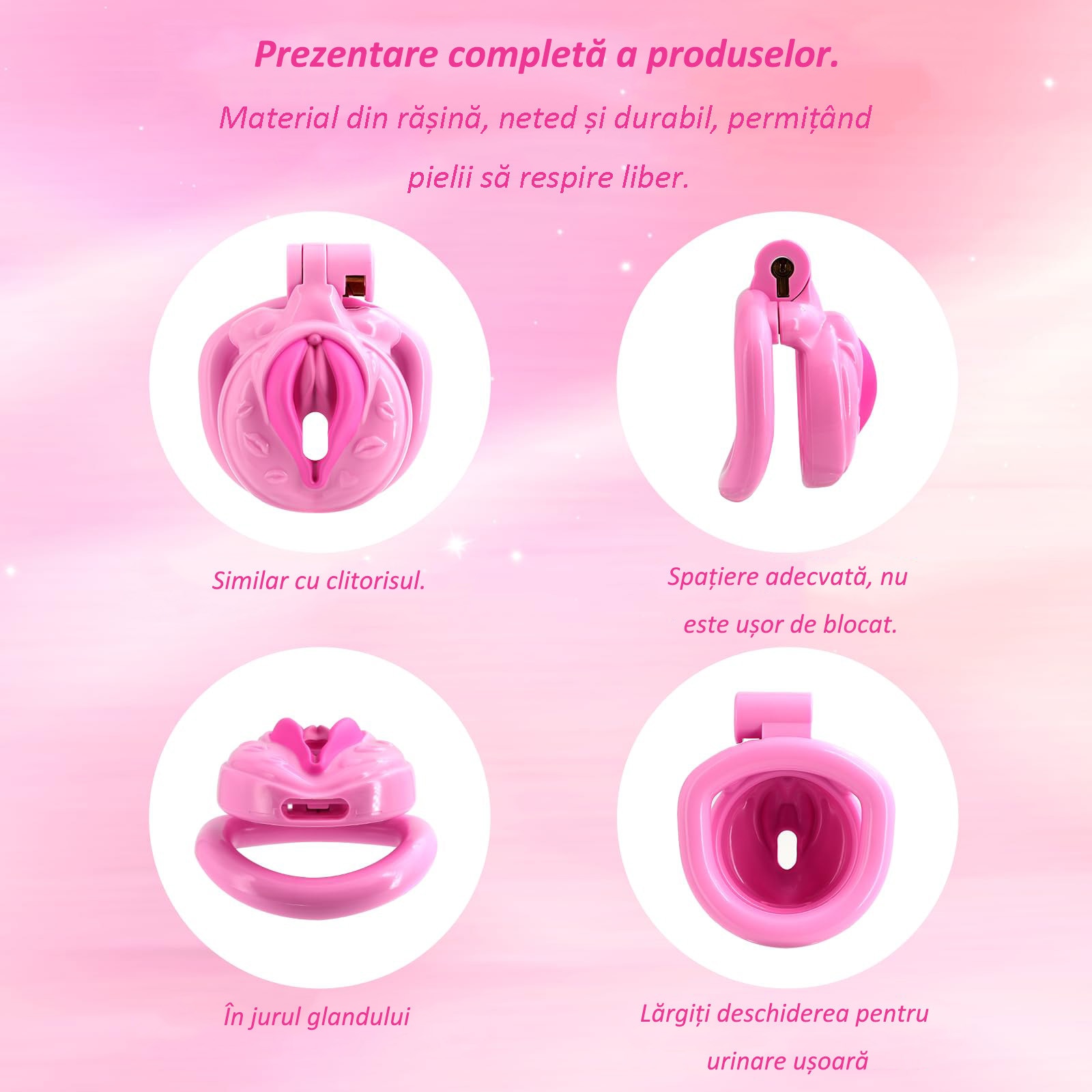 Dispozitiv de castitate pentru barbati LUETRIXE, cusca usoara din ABS+rasina, 4 inele interschimbabile, centura si lacat invizibil, pentru exercitii si abstinenta, roz