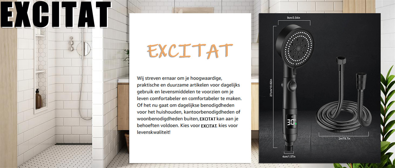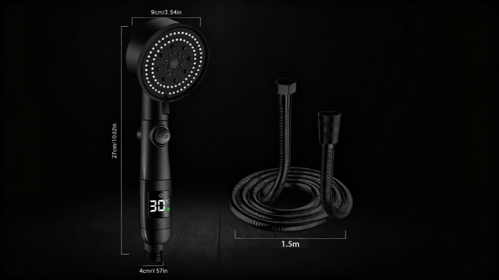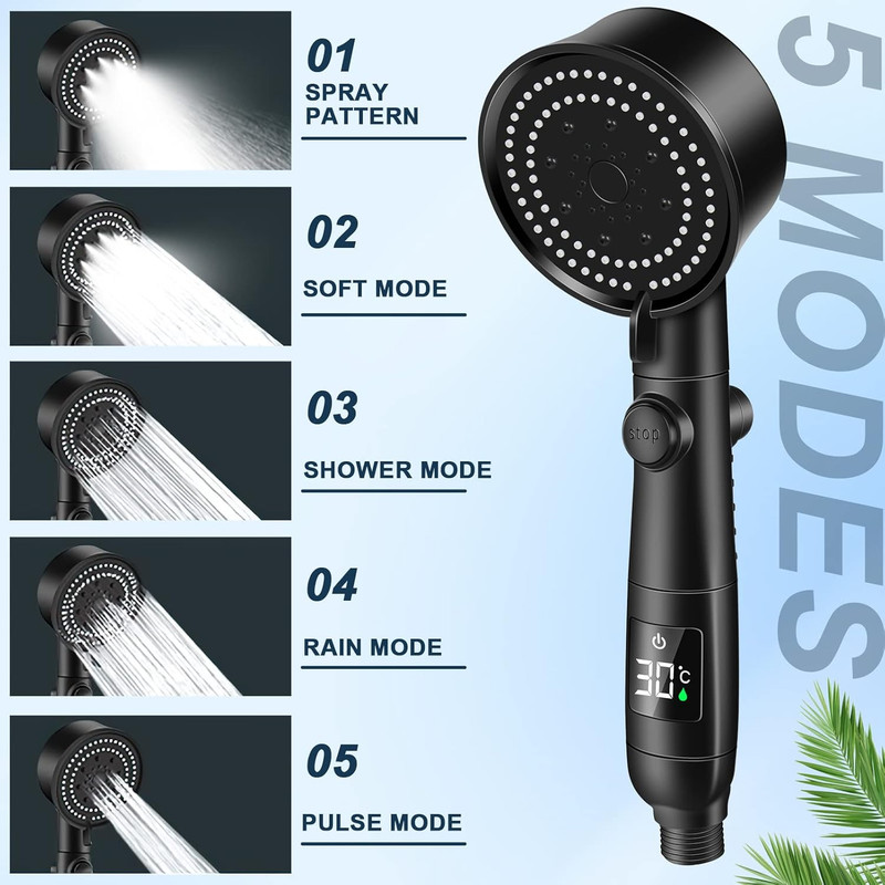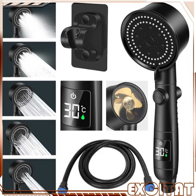 Dus Inteligent cu Afisaj Digital al Temperaturii, Excitat®, Cap de Dus de Inalta Presiune, Jet Puternic, cu Suport si Furtun Incluse, 5 Moduri de Functionare, Spray, Moale, Ploaie, Roua Muntelui, Puls, Negru