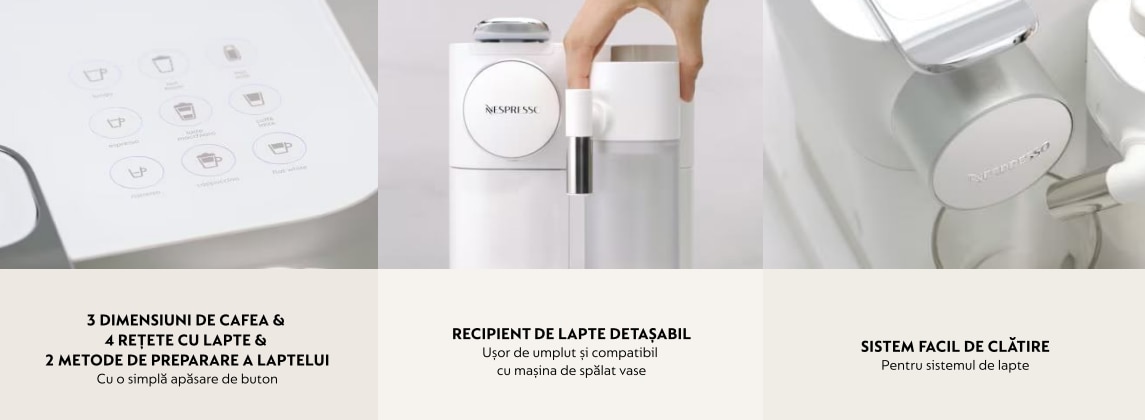 Espressorul Gran Lattissima are 3 metode de extractie a cafelei: Ristretto, Espresso, Lungo și poate prepara 4 rețete cu lapte: Cappuccino, Flat white, Caffé Latte, Latte Macchiatto. Dacă doriți un espressor care să aibă funcția de apă caldă, vă recomandăm Citiz Platinum: www.nespresso.com/ro/ro/order/machines/original/aparat-cafea-citiz-platinum